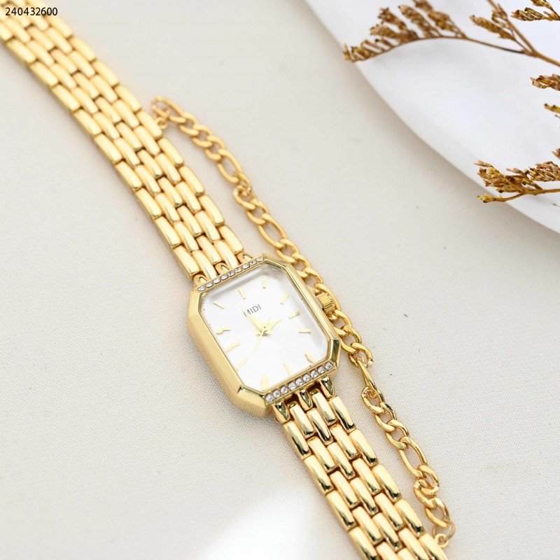 ساعة نسائية مستطيلة مع حزام مجدل لون ذهبي