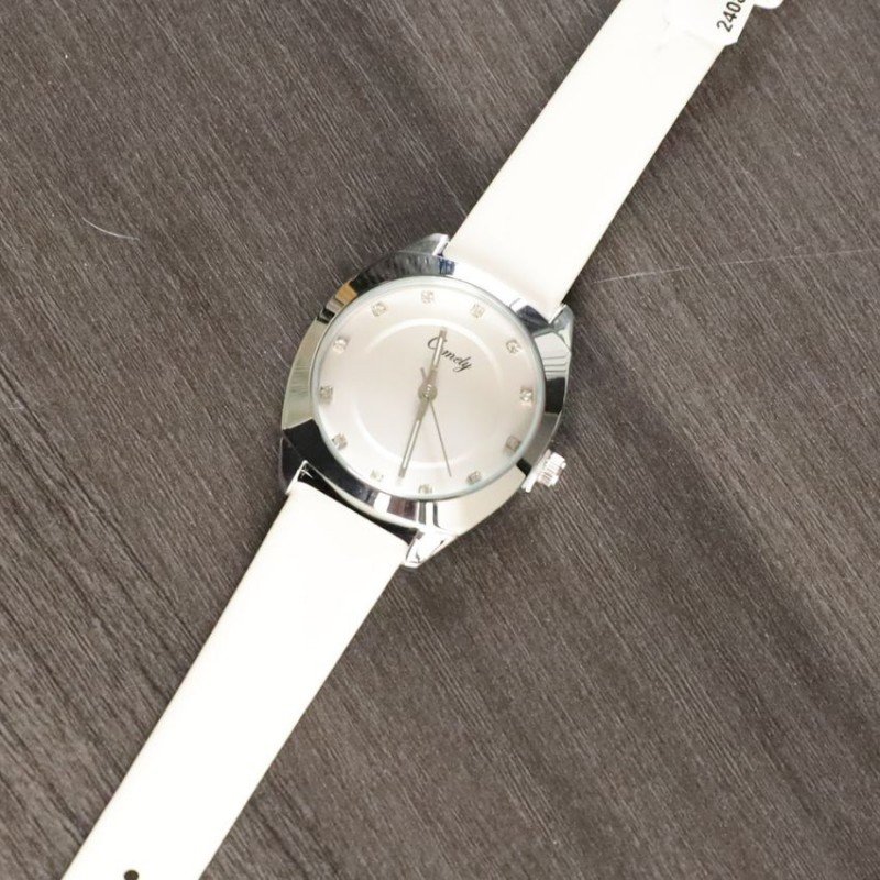 ساعة نسائية دائرية مع حزام جلدي (اللون: فضي)