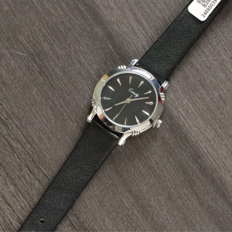ساعة نسائية دائرية مع حزام جلدي (اللون: فضي و اسود)