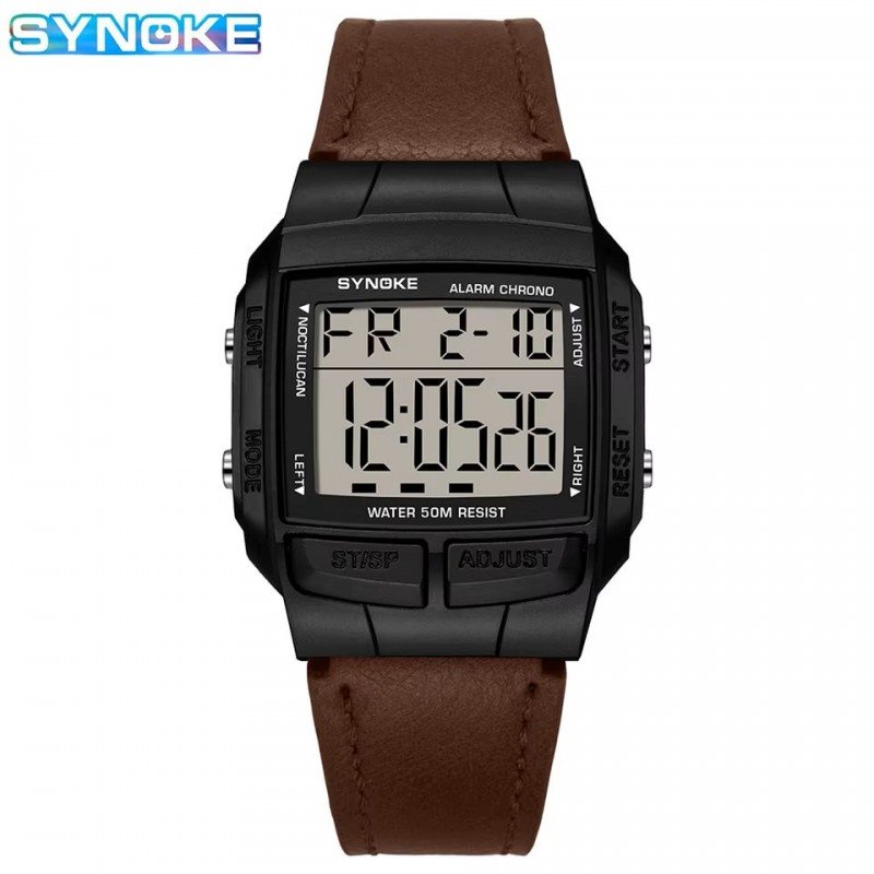 ساعة يد رقمية رجالية مع إضاءة LED – حزام جلد لون بني – ماركة Synoke