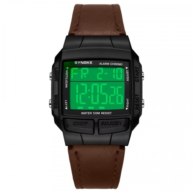 ساعة يد رقمية رجالية مع إضاءة LED حزام جلد لون بني ماركة Synoke