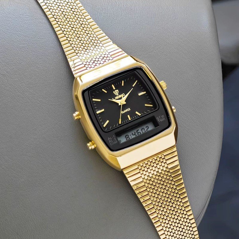 ساعة يد فخمة للرجال – ثنائية عقارب ورقمية – لون ذهبي – ماركة LieBig