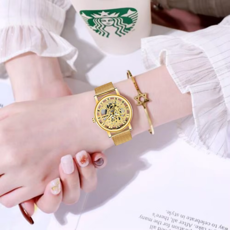 ساعة عقارب مع خلفية مفرغة تظهر اجزاء الساعة حزام معدني شبك