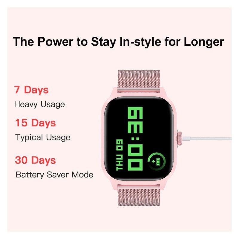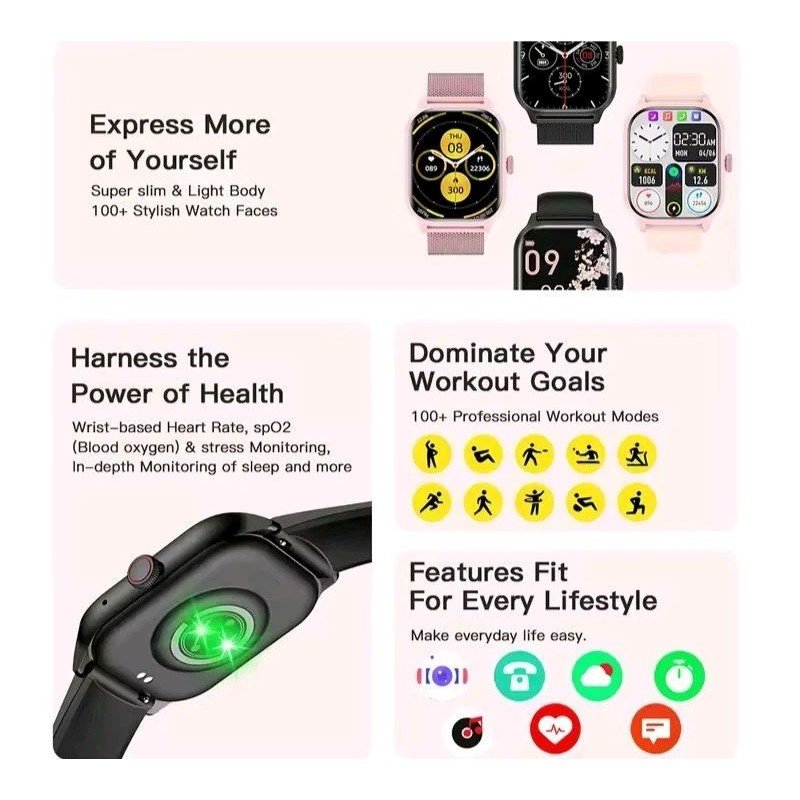 المميزات:شاشة لمس 2.01 بوصةمعالج JQ7011 مع ذاكرة فلاش 64MBبطارية 280mAh تدوم حتى 5 أيام استخدام وأكثر من 15 يوم في وضع الاستعدادمقاومة للماء بمعيار IP67تتبع الصحة: معدل ضربات القلب، الأكسجين في الدم، تتبع النومأوضاع رياضية متعددة (ركض، دراجة، كرة قدم، كرة سلة وغيرها)مكالمات بلوتوث، إشعارات التطبيقات، تحكم بالموسيقىمتوافقة مع Android 6.0 فما فوق و iOS 10.0 فما فوق