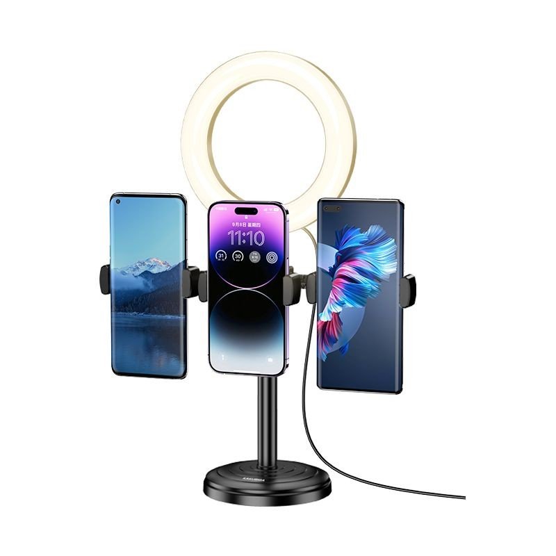 ستاند مكتبي مع حلقة إضاءة يحمل 3 جوالات لتصوير اللايفات – من KAKUSIGA