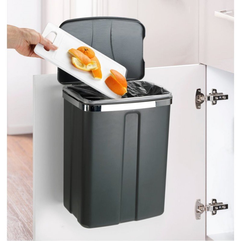 سلة داخلية للنفايات تعلق داخل او خارج خزانة المطبخ بدون حفر أو براغي. مصنوعة من البلاستيك مع حامل معدني. الحجم 12 لتر مناسبة لأبواب الخزائن حتى سمك 2 سم الأبعاد: 26*21.5*37 سم