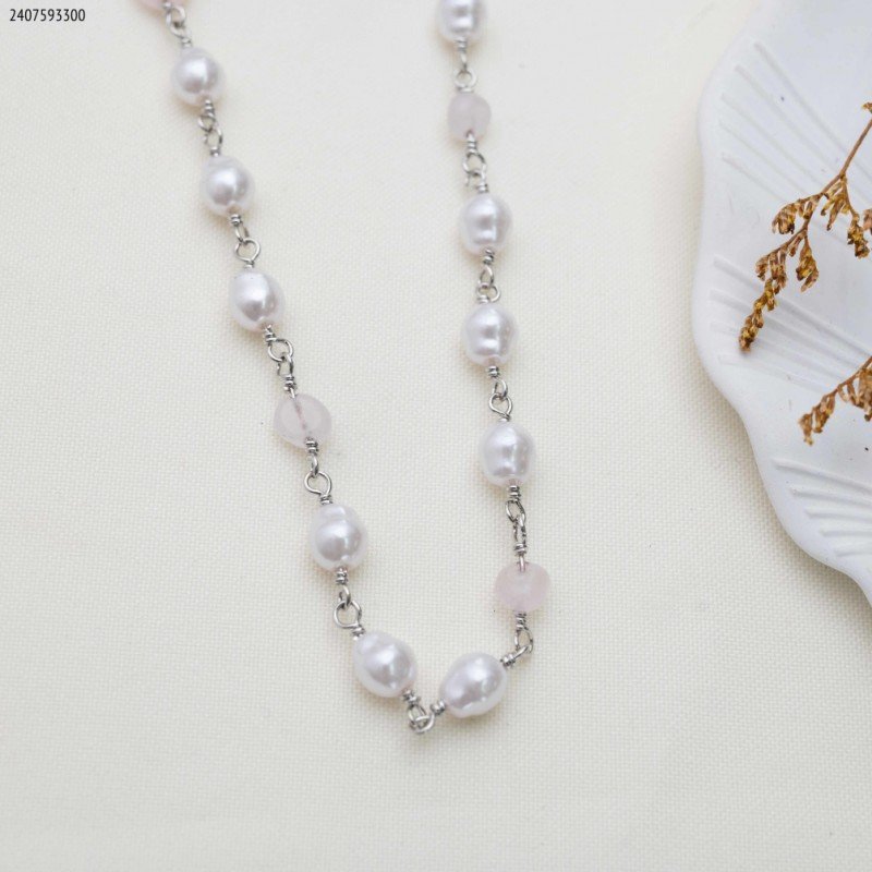 سلسال حبات لولو مع احجار زركون وردية لون فضي