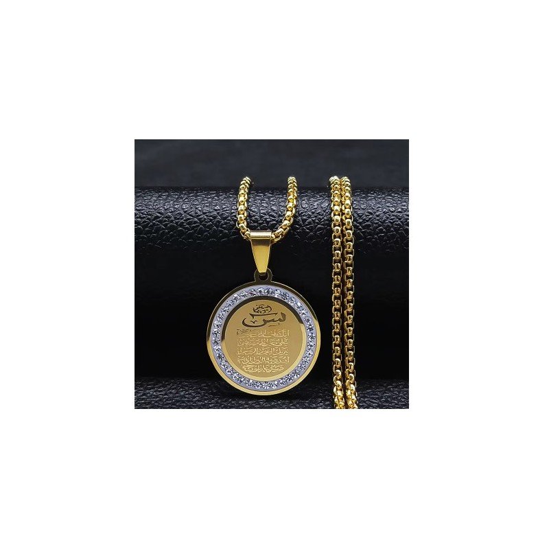 سنسال ذهبي بتصميم سورة يس ومرصع بالكريستال اللامع- مصنوعة من الستانلس ستيل المقاوم للصدأ