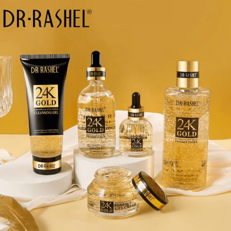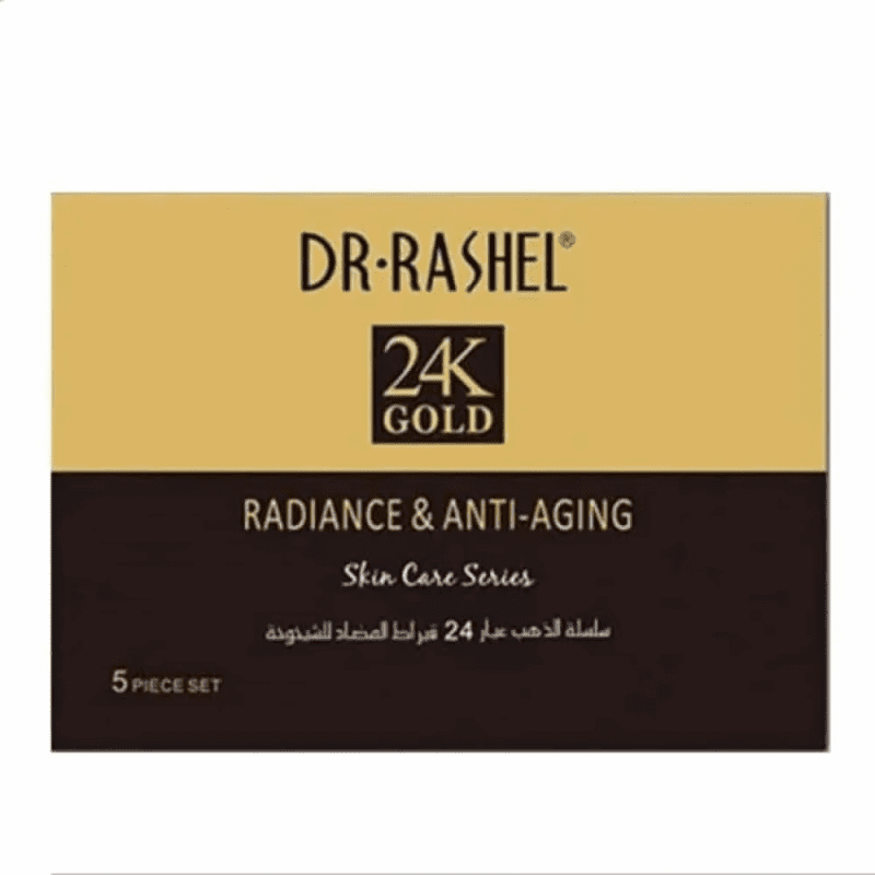 سلسلة دكتور راشيل للتألق الذهبي ومقاومة الشيخوخة عيار 24 قيراط – عبوة من 5 قطع هي مجموعة فعالة للغاية وتشمل :