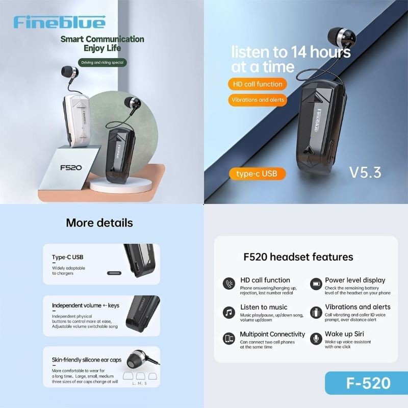 سماعة اذن Fineblue F-520 بلوتوث بمشبك بلوتوث، ومدخل Type-C.  المميزات: