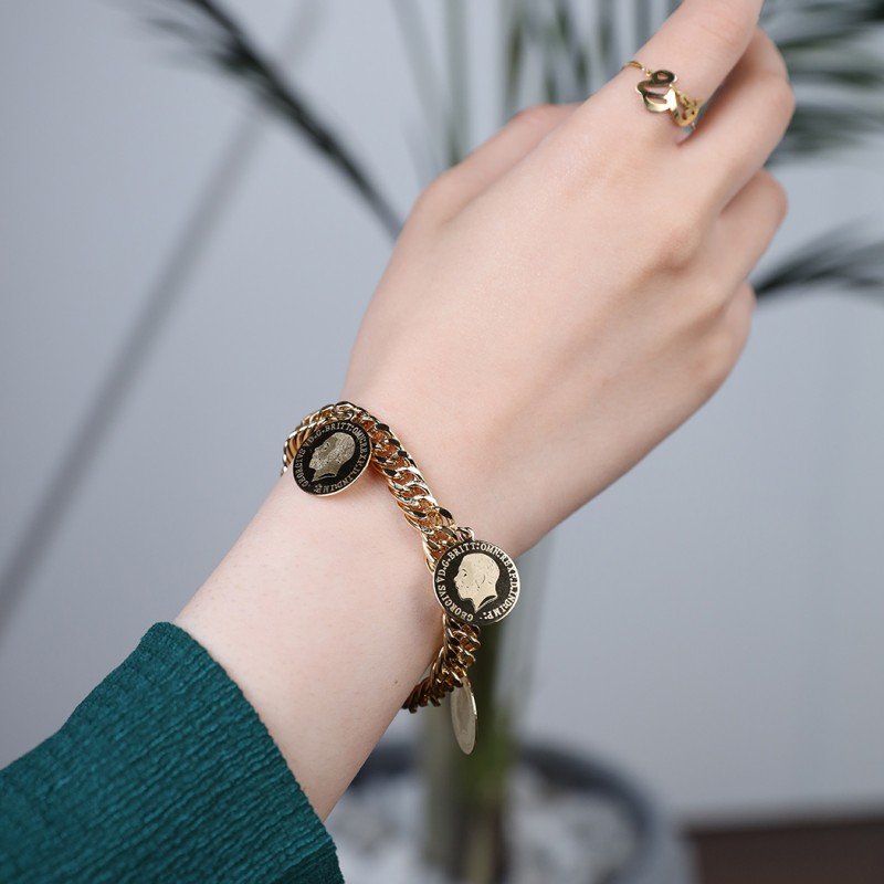 ✅ تفاصيل المنتج: سوار مصنوع من الذهب ومزخرف بخمس ليرات إنجليزية تضيف له لمسة من التراث والمجد.