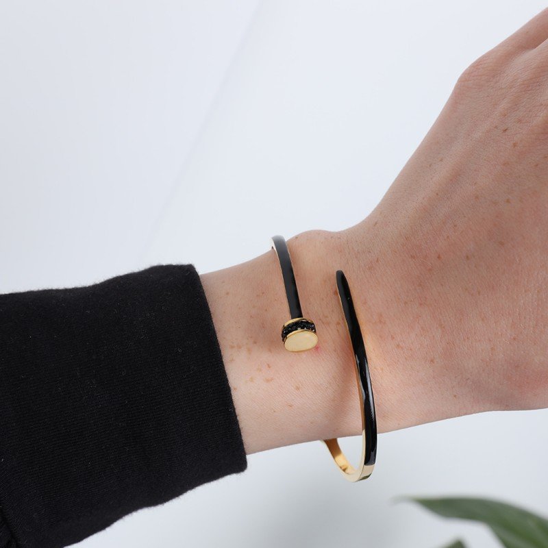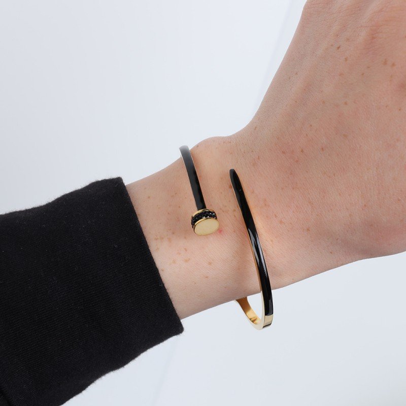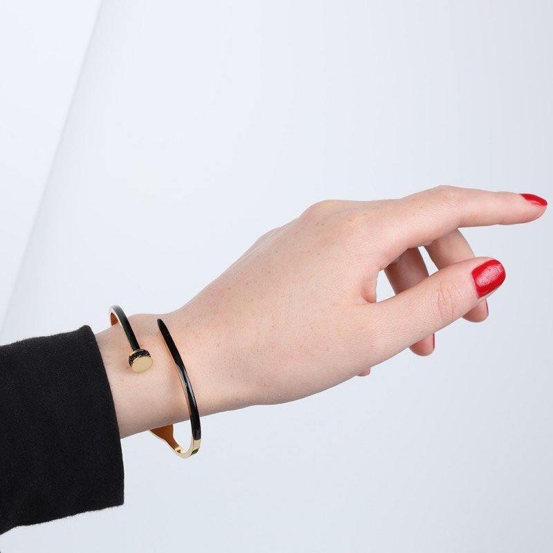 ✅ التصميم: يتميز هذا السوار بتصميم مسمار أنيق مع لمسة من اللون الأسود الذي يعزز من مظهره العصري والمميز. الشكل الجريء يضيف لمسة من القوة والأناقة، بينما اللون الأسود يضفي تباينًا رائعًا مع الذهب، مما يجعله قطعة فريدة.