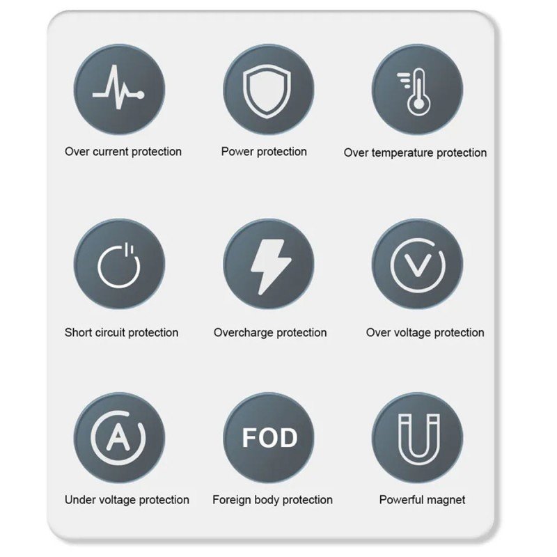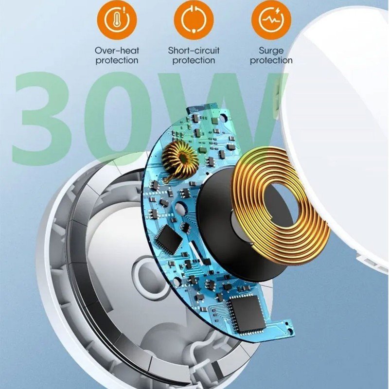 ✅ شاحن لاسلكي مغناطيسي. ✅ اللون: أسود. ✅ القدرة: 30 واط يدعم الشحن السريع. ✅ منفذ مزودوج تايب سي و يو اس بي. ✅ هيكل نحيف وخفيف الوزن ✅ صنع في الصين.