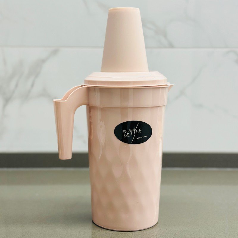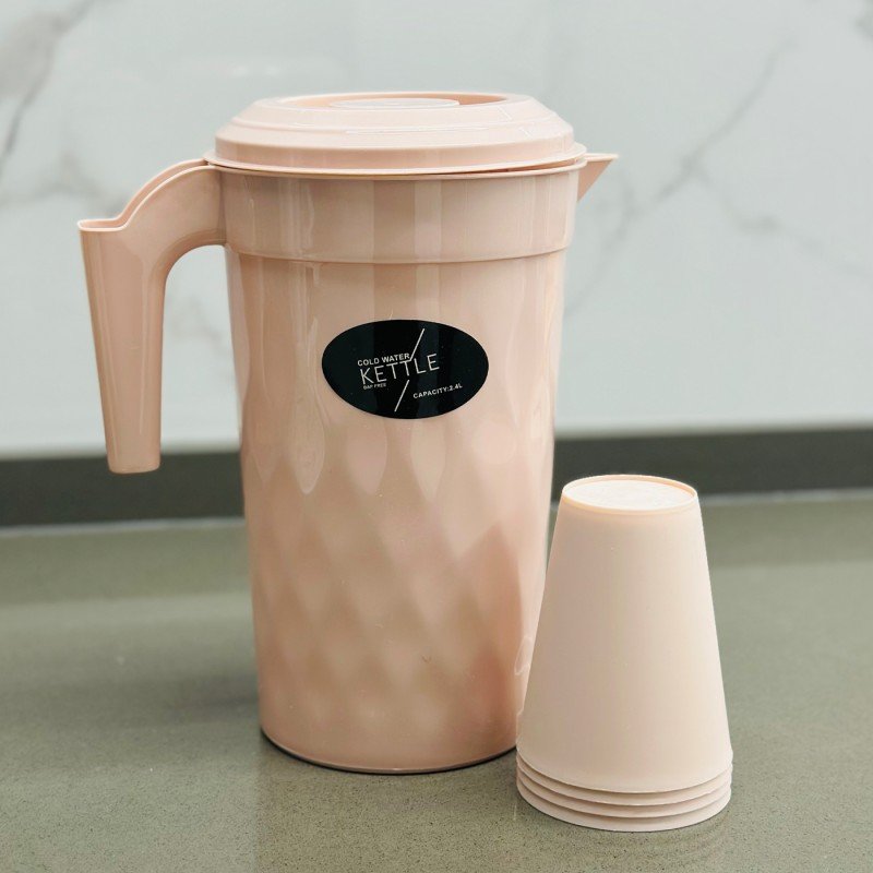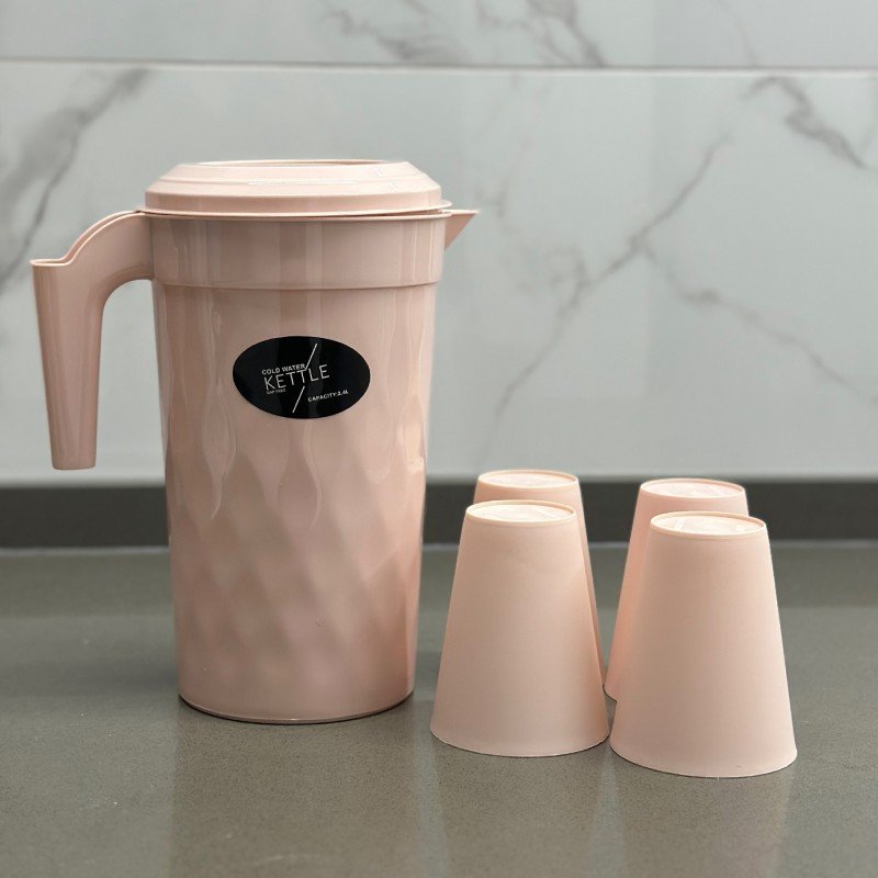 ✅ شاف (ابريق) بلاستيك بمقبض مريح مع غطاء بلاستيك وطقم مكون من 4 كاسات بلاستيك.