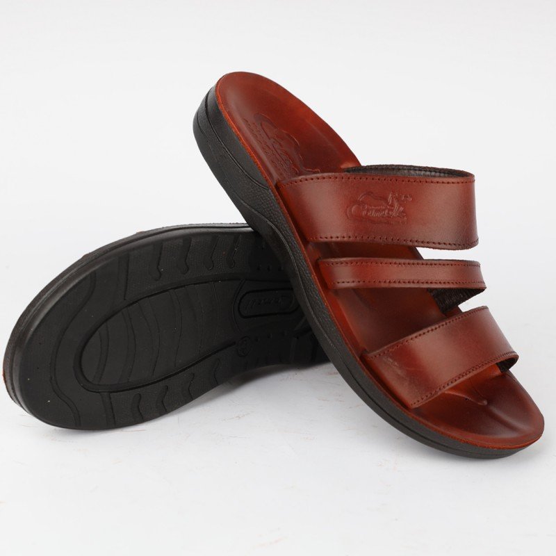 شبشب جلد بتصميم مفتوح الأصابع للرجال لون بني ونعل أسود
