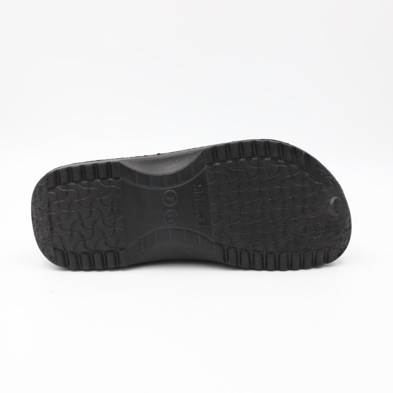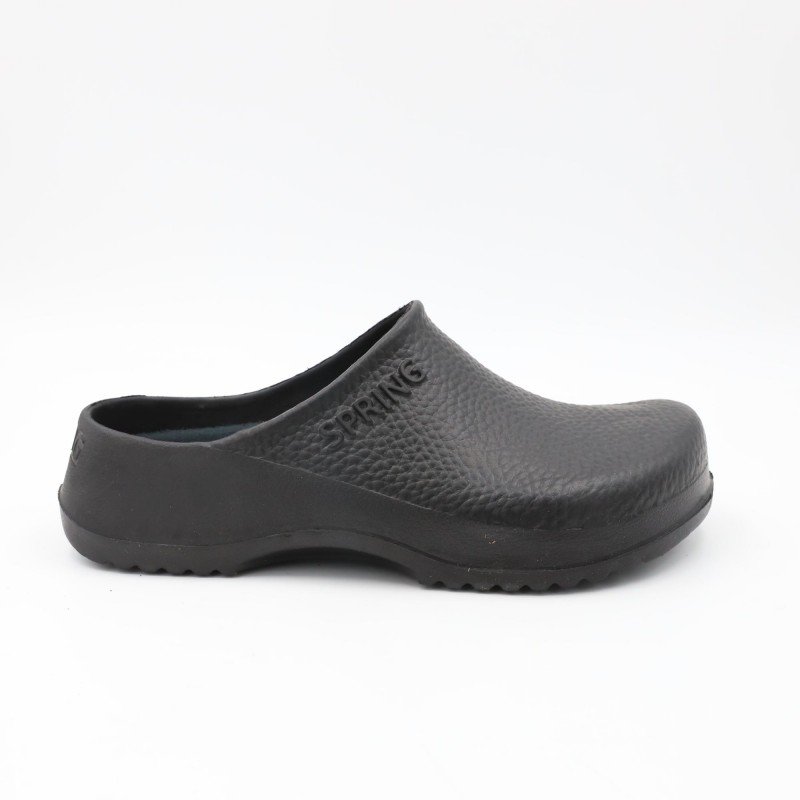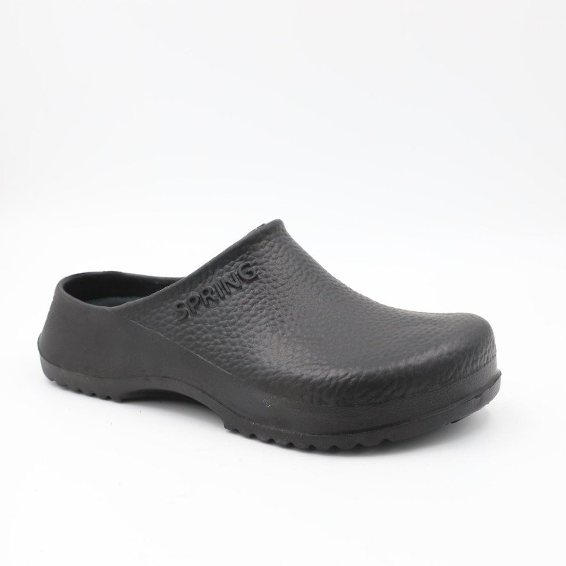 بابوج عملي باللون الأسود من ماركة SPRING، مصمم خصيصًا للمطابخ والأطباء والممرضين. يتميز بخفة الوزن، راحة عالية عند المشي، ومادة قوية مقاومة للماء والانزلاق. مناسب للاستخدام اليومي الطويل في بيئات العمل المجهدة مثل المستشفيات والمطابخ.