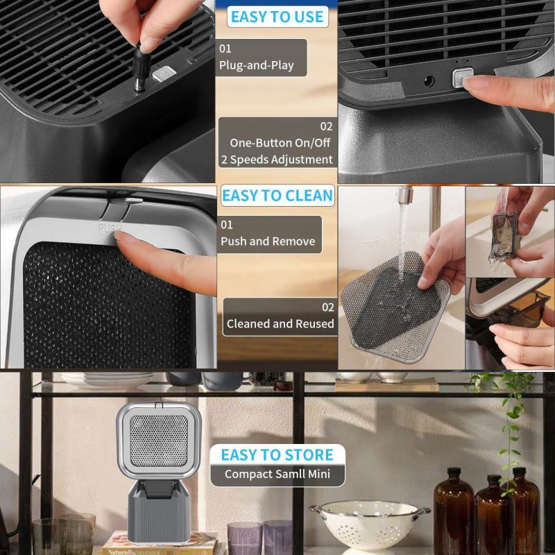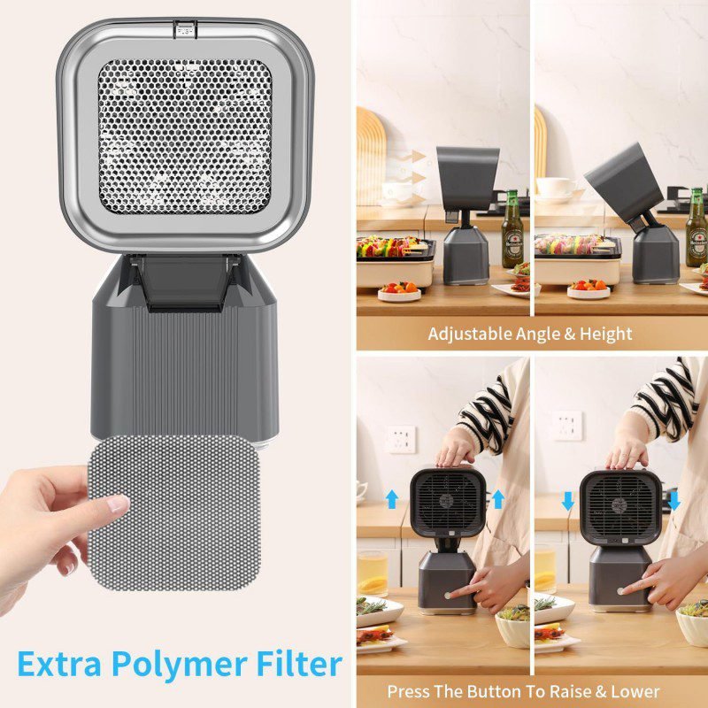 المميزات: ◆ فلتر فعّال لإزالة الدخان والروائح الناتجة عن الطهي. ◆ وضعيّتان للتشغيل مع سرعتين للمروحة. ◆ إمكانية تعديل الارتفاع ليتناسب مع نوع الطهي والمكان. ◆ تصميم أنيق وصغير الحجم، مناسب للطاولات والمطابخ المفتوحة.