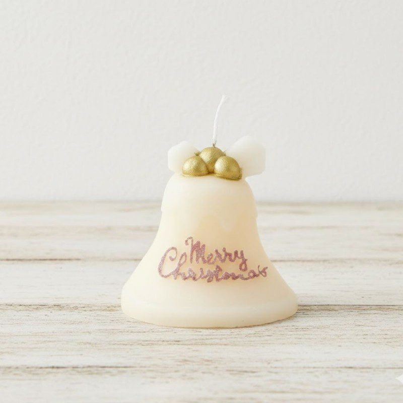شمعة كريسماس أنيقة بتصميم جرس العيد، بلون أبيض ناعم مع تفاصيل حمراء وشَبْرة فضية تضيف لمسة فخمة واحتفالية. مكتوب عليها Merry Christmas لتكون قطعة مثالية لزينة الكريسماس ولمحبي الديكور الشتوي الراقي.