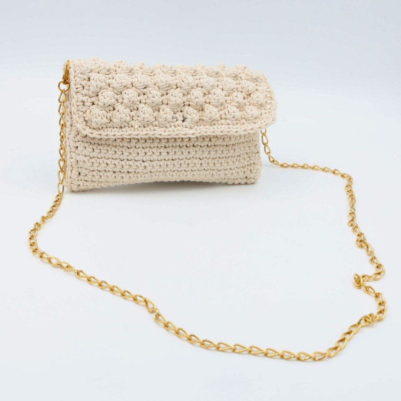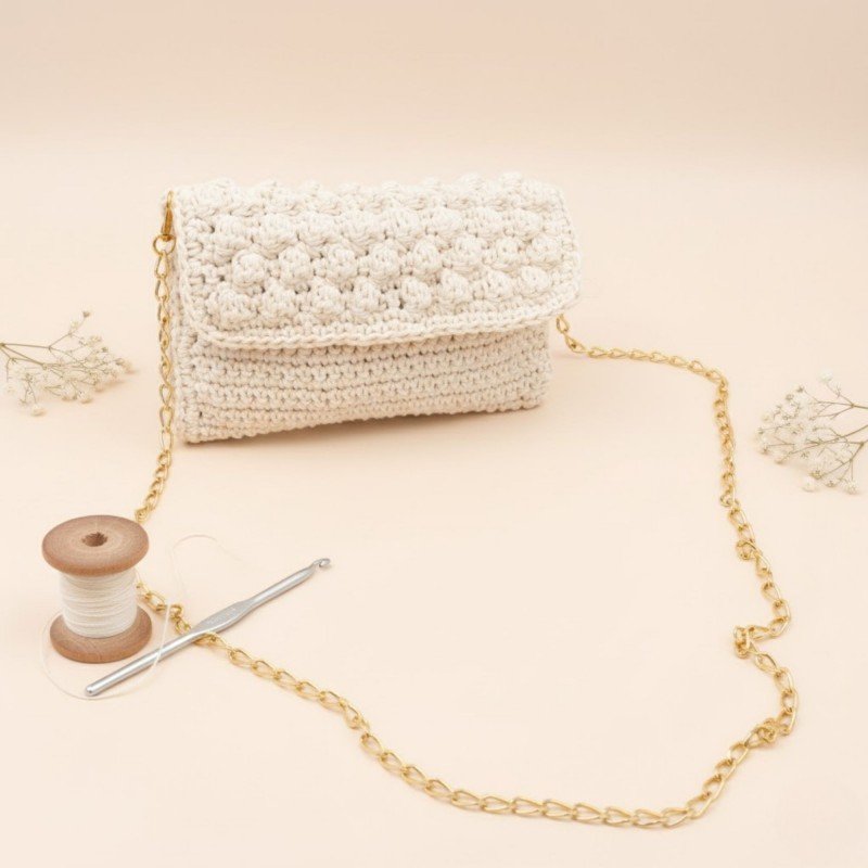 شنطة يد كروشيه (Handmade) ✅ مشغولة يدويًا بخيوط قطنية عالية الجودة بتصميم أنيق ومتين ✅ تحتوي على فاصل داخلي لتقسيم الأغراض وتنظيمها بسهولة ✅ مزودة بيد سلسلة معدنية تضيف لمسة عصرية راقية ✅ إغلاق بكبّاس عملي يحافظ على أغراضك بأمان ✅ اللون: عاجي ناعم يناسب الإطلالات الكلاسيكية والأنثوية ✅ الحجم: صغيرة – مثالية للمناسبات والخروج الخفيف ✅ الأبعاد: 14 × 22 سم