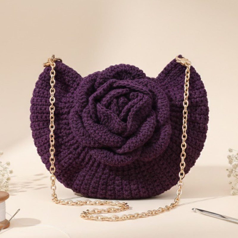 شنطة كروشية بتصميم فني أنيق على شكل وردة بارزة، مصنوعة يدويًا بعناية لتكون قطعة لافتة ومميزة. اللون الخمري الغني يعطيها طابعًا أنثويًا راقيًا، مع يد سلسلة ذهبية تضيف لمسة فخامة وتكمل التصميم بشكل جذاب.