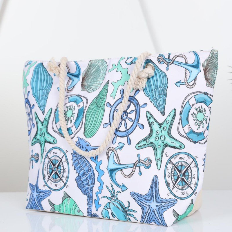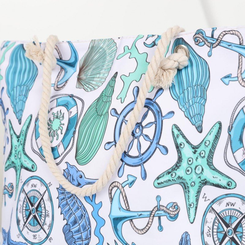 شنطة يد قماش للرحلات بخرفة بحرية لون أبيض