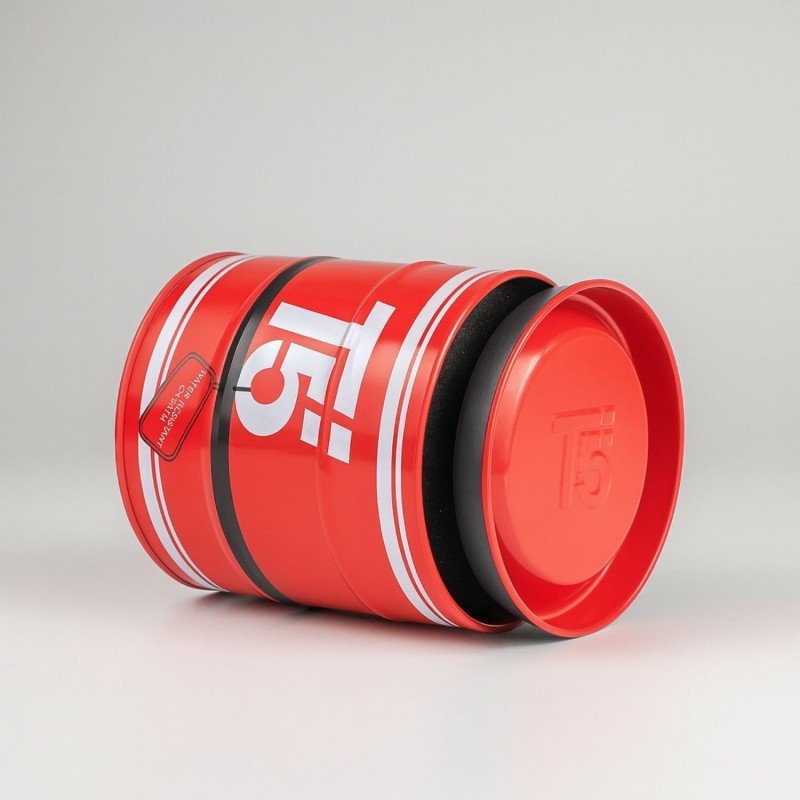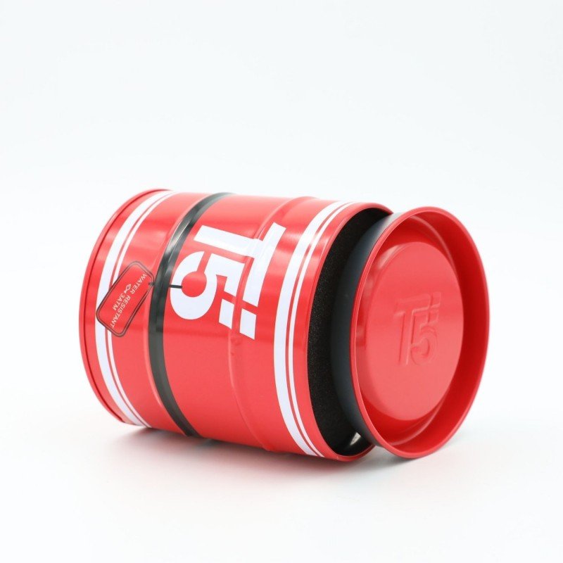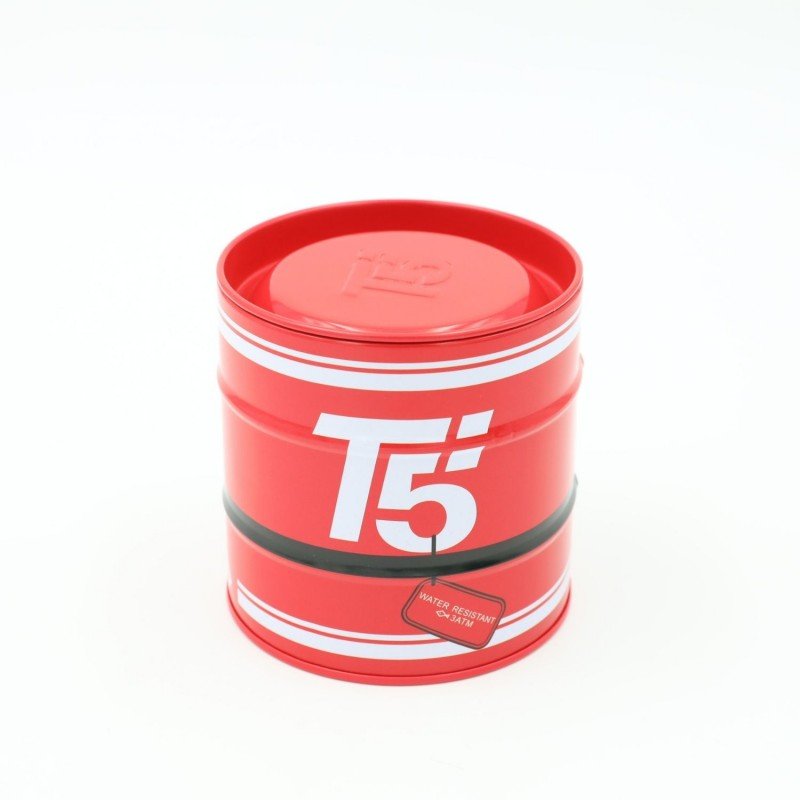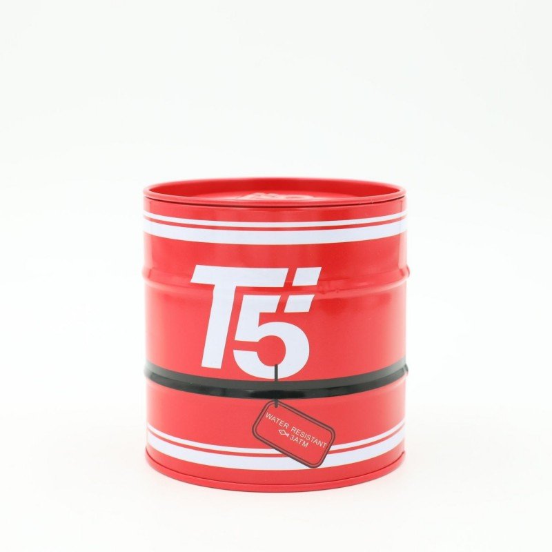 صندوق هدايا معدن شبابي للساعه شكل اسطوانه لون أحمر تفاصيل أبيض وأسود