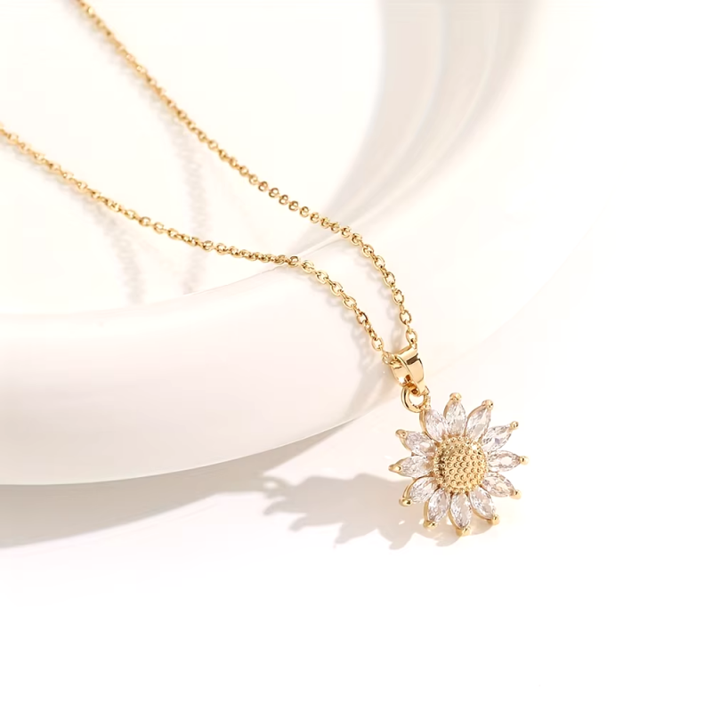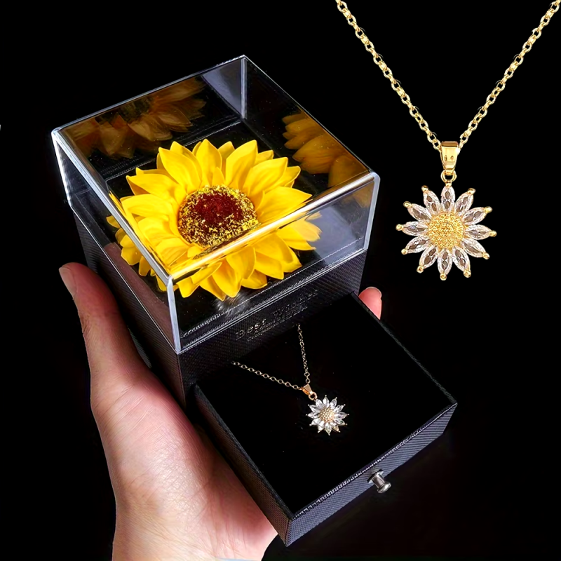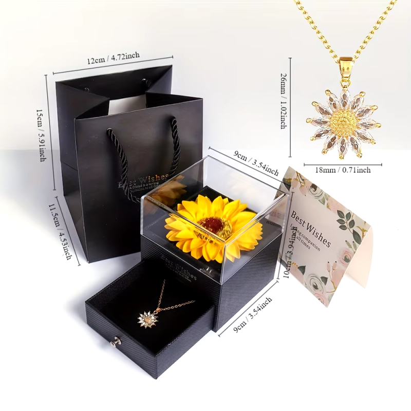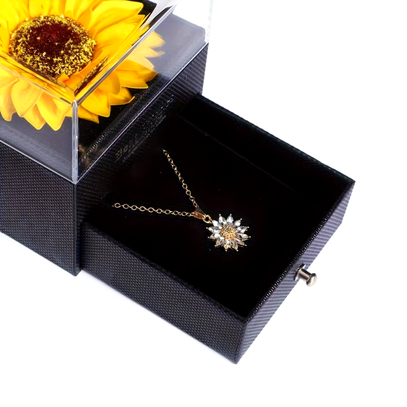 وفي أسفله جرار يحتوي على سنسال ذهبي مع تعليقة وردة صفراء تشبه شعار الشمس ستانلس مقاوم للصدأ .