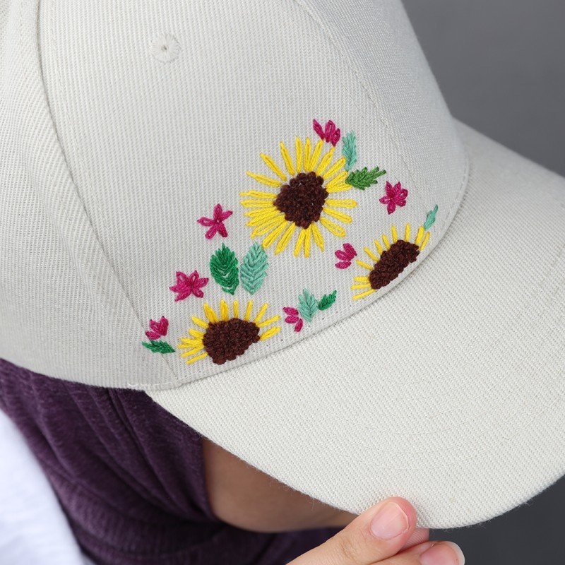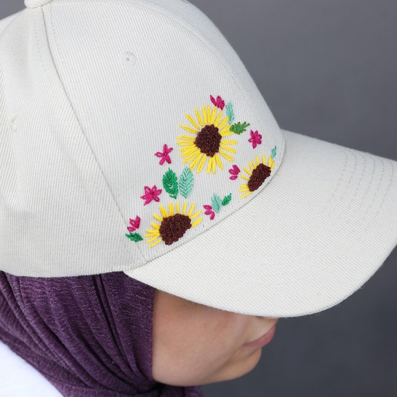✅ التصميم: طاقية قماش مزخرفة يدوياً بتصميم عبّاد الشمس، مما يضيف طابعاً فنياً وأنيقاً على الطاقية. التصميم الأمامي المنمق يزيد من جمالها وأناقتها.