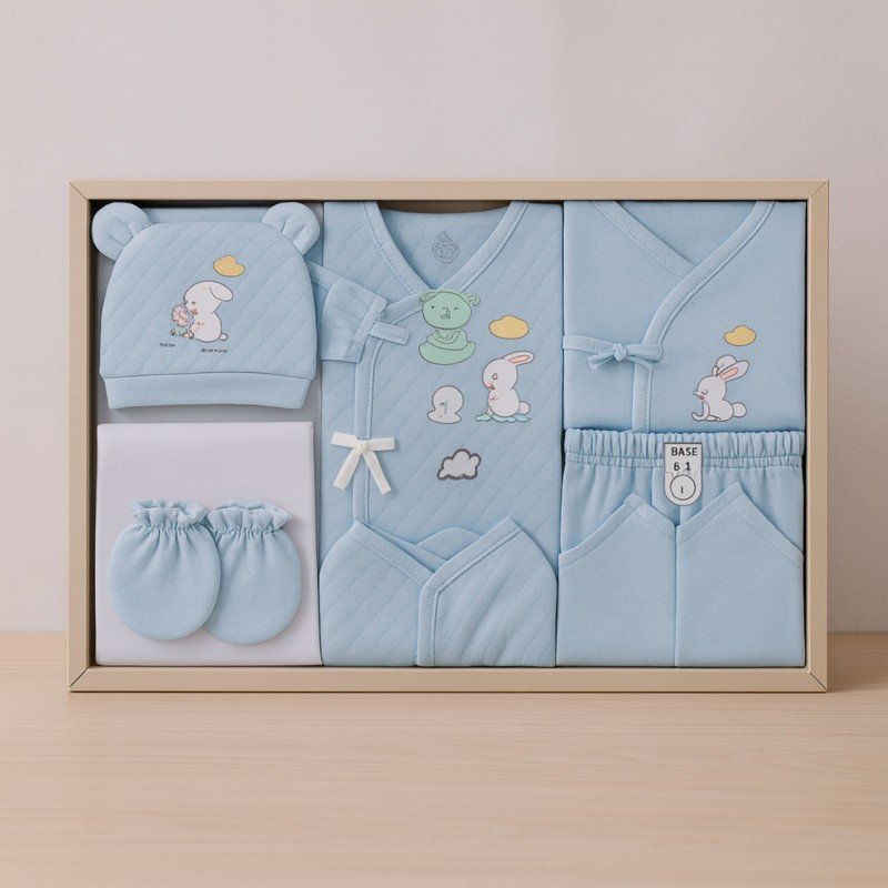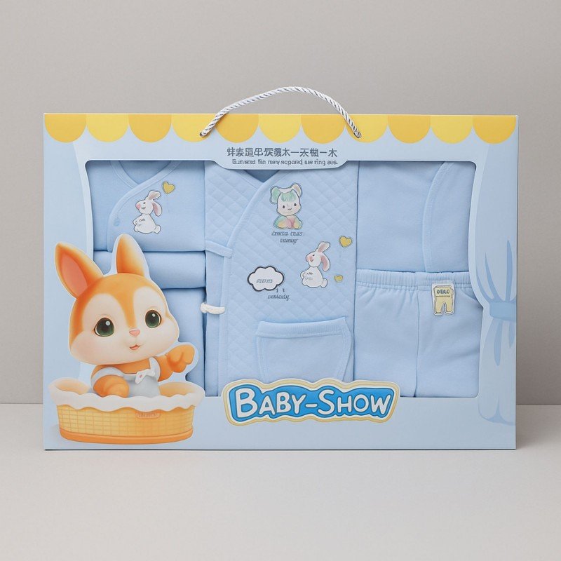 طقم استقبال بيبي لون أزرق بصندوق مرتب كهدية ( تبان و بيجامة + طاقية + كفوف + كوفلية + مناشف + قطع قماش )