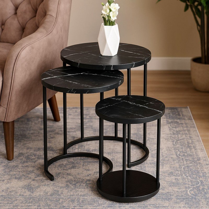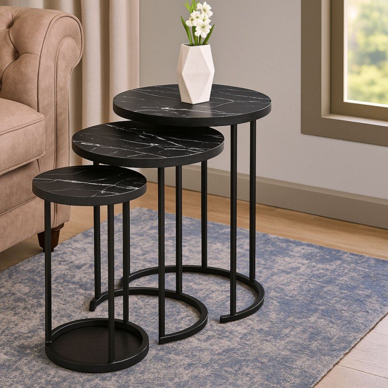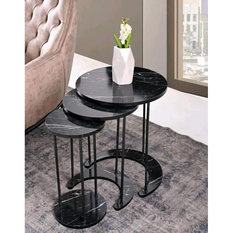 يتميز الطقم بسطح مصقول فاخر بلمسة رخامية فنية، وهيكل متين يمنح استقرارًا ومتانة عالية، مما يجعله الخيار المثالي لاستخدامه كطاولة جانبية، أو حاملًا للديكور، أو حتى كعنصر جمالي مستقل. يمكن ترتيب القطع بشكل متداخل أو منفصل حسب المساحة والمزاج، ليمنحك مرونة في الاستخدام وتنوعًا في الأسلوب.