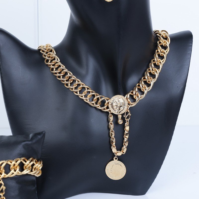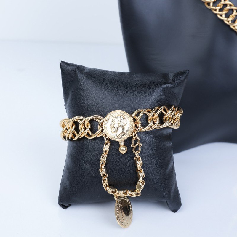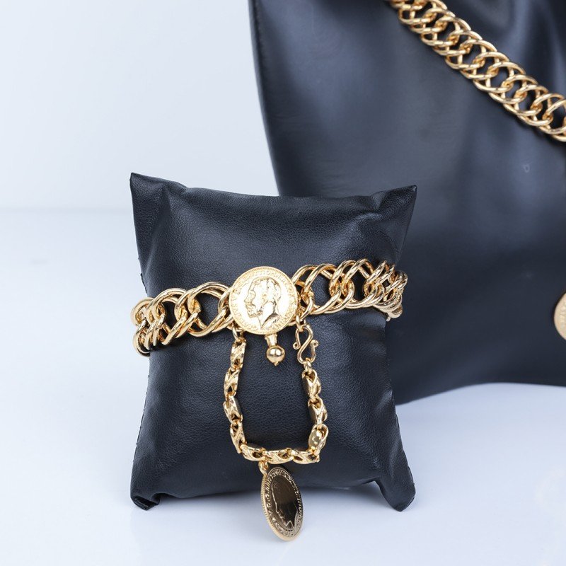 ✅ التصميم:طقم أكسسوارات مكون من 4 قطع، يتضمن تصميمات جنزير وليرات ذهبية، مما يضفي لمسة من الفخامة والجاذبية على الطقم.