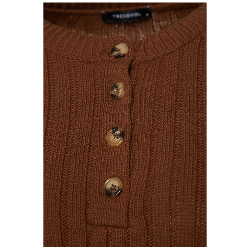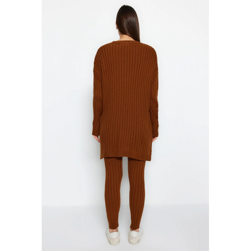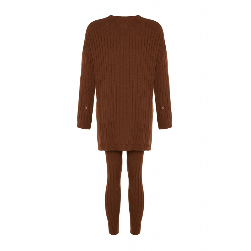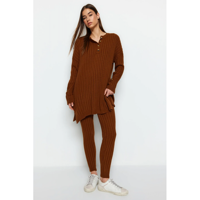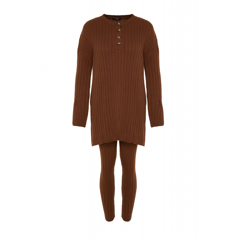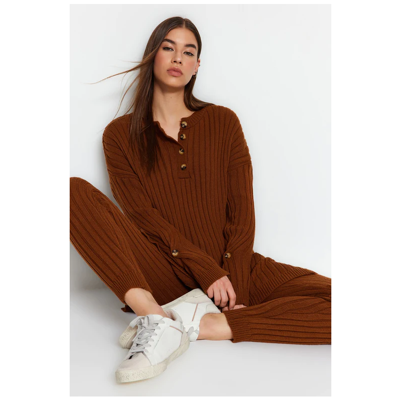 ✅ طقم ترينديول بنطال وبلوزة تريكو بأزرار للنساء لون كرميدي