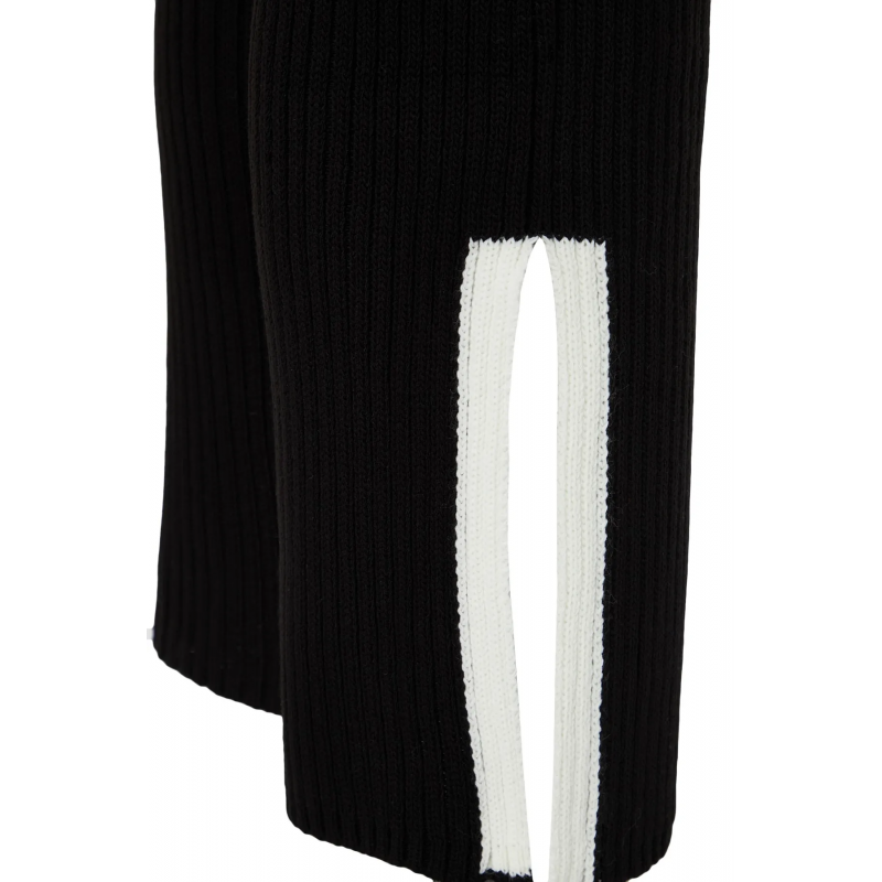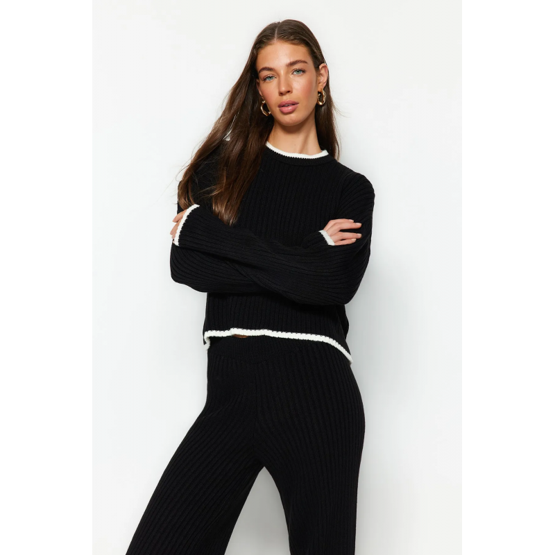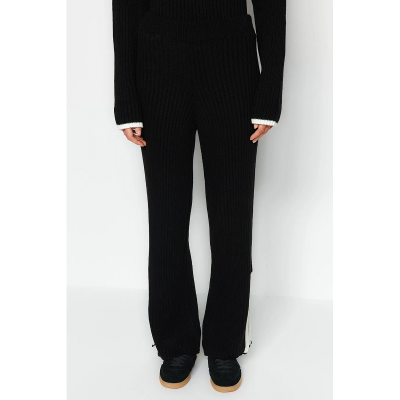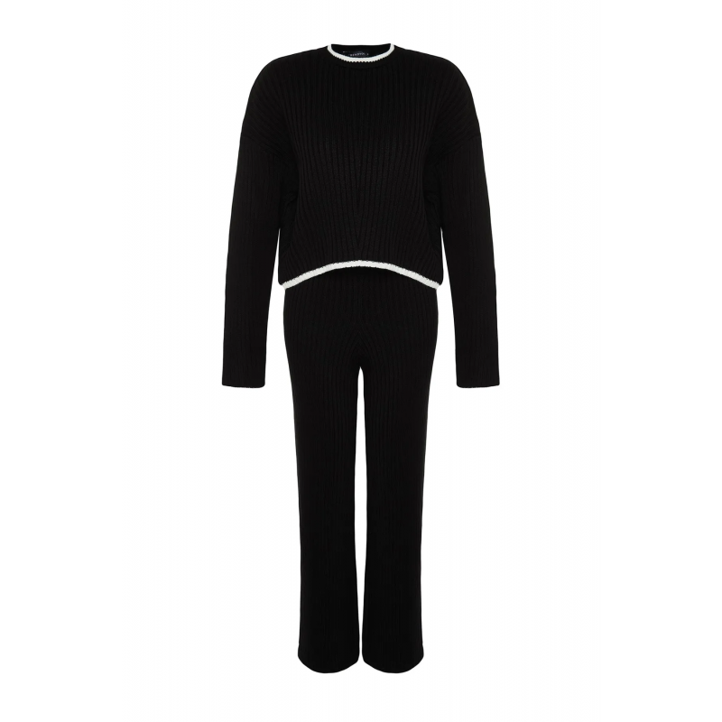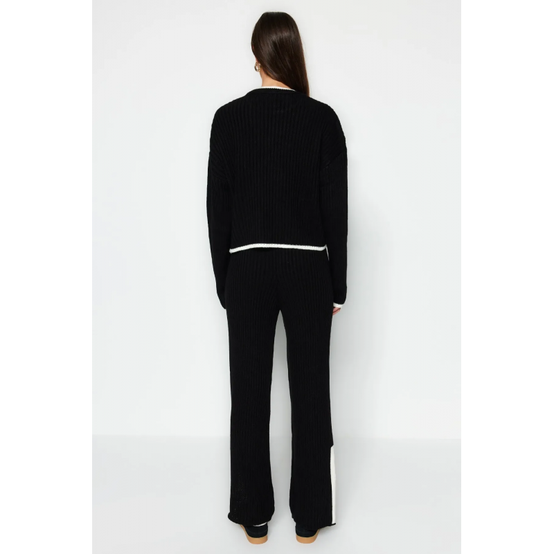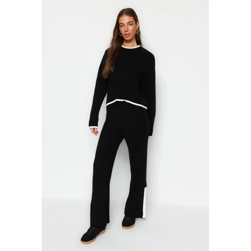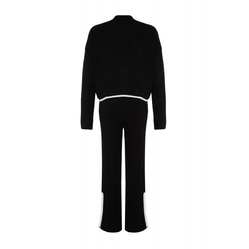 ✅ طقم ترينديول بنطال وبلوزة مخططة برقبة عالية للنساء لون أسود