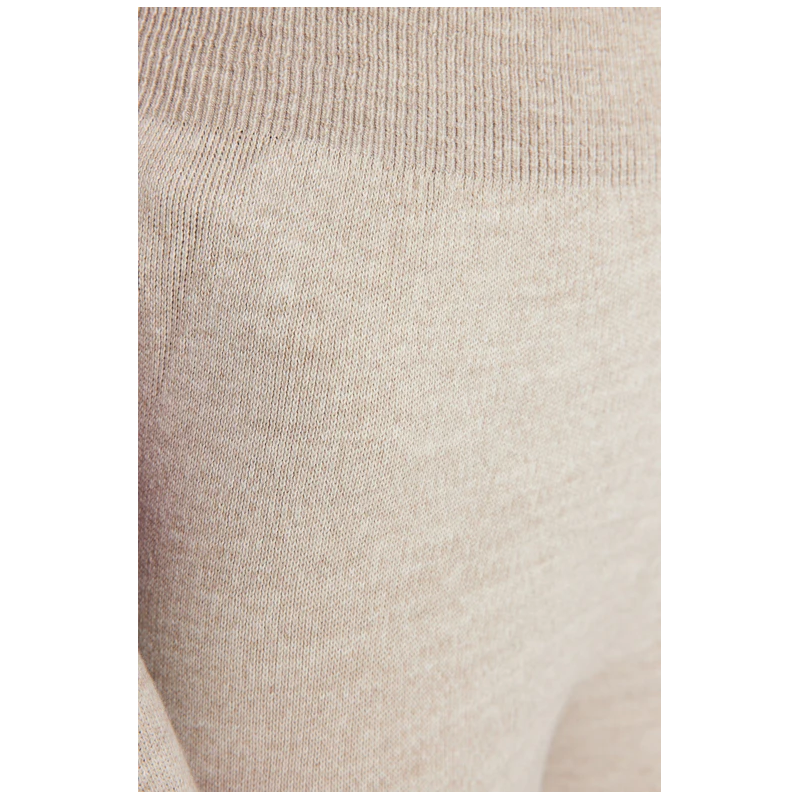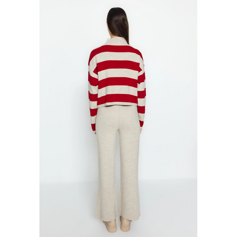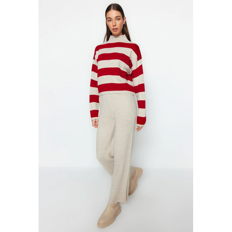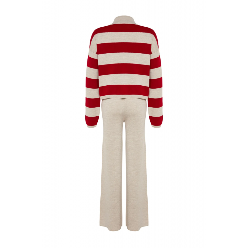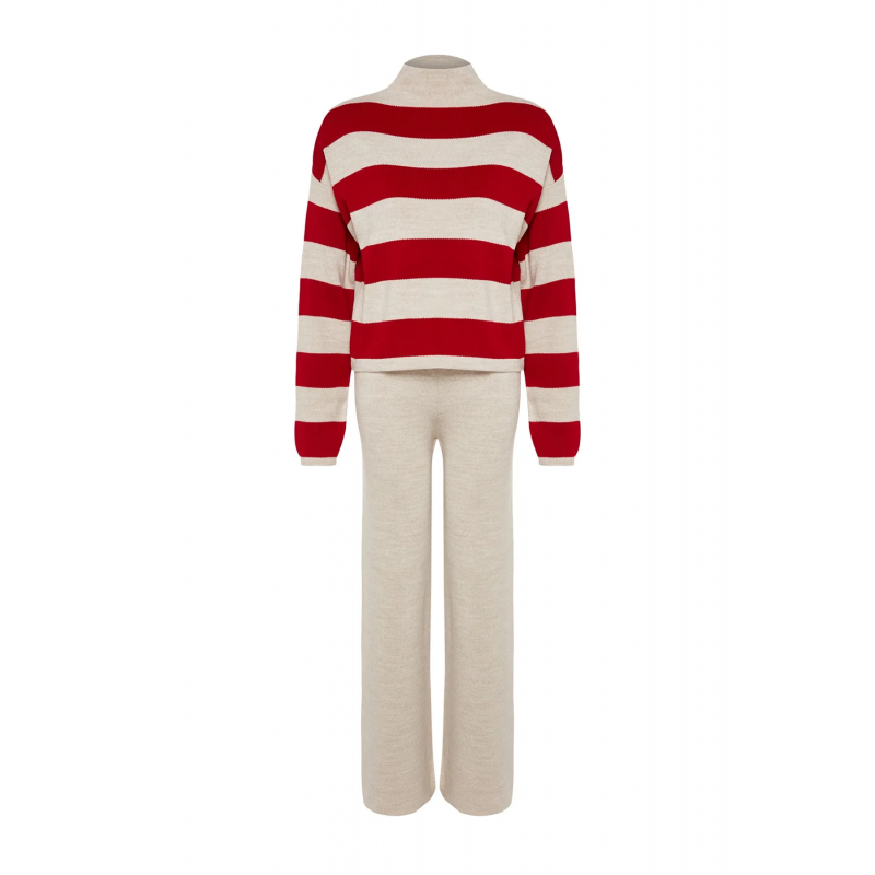 ✅ طقم ترينديول بنطال وبلوزة مخططة برقبة عالية للنساء لون أحمر وبيج