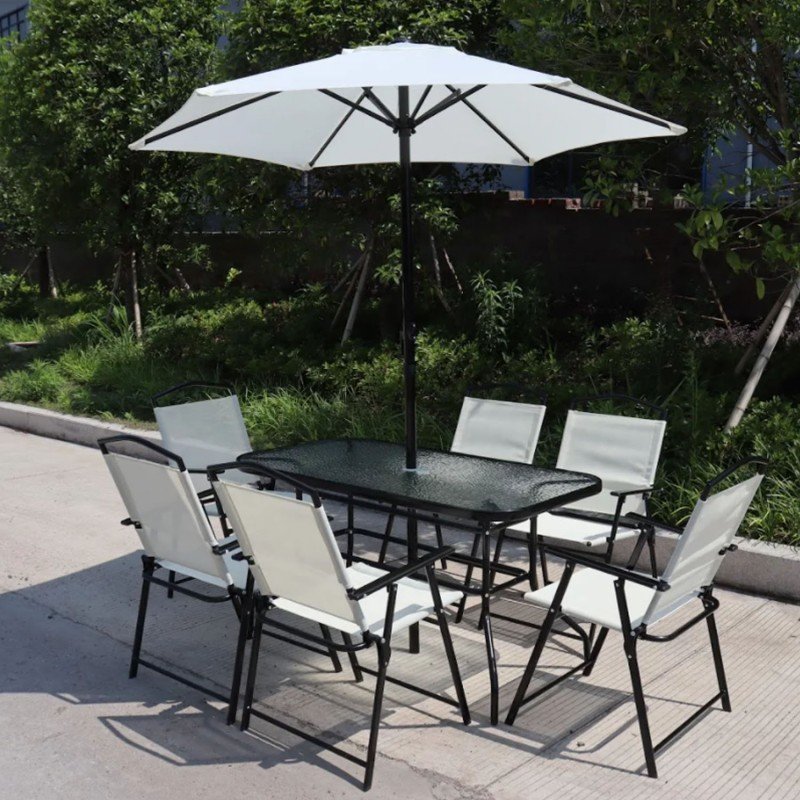 4 قطع2 كراسي حدائقحجم الكرسي طول/عمق/ارتفاع90*61*56قطر انبوب الكراسي 28 ملمقماش لون بيجطاولة زجاج مقوى عرض 70 طول 130 ارتفاع 70 انبوب طاولة لون اسود بقطر 24 ملممظلة قطر 2 متر وارتفاع 2.2 مترقطر انبوب المظلة 38 ملماغلاق المظلة بدوران يدوي سهل