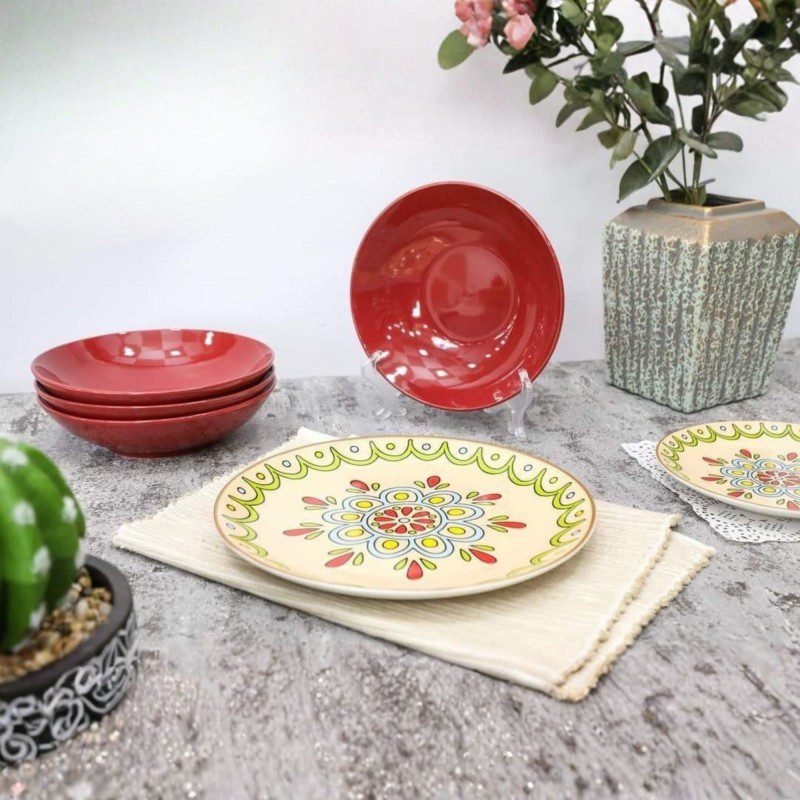 طقم الصحون المغربي هو الخيار المثالي لإضافة لمسة من الأصالة والفن إلى مائدتك. يتميز بتصميم مستوحى من الثقافة المغربية التقليدية مع تفاصيل أنيقة تجعل كل وجبة تجربة مميزة.