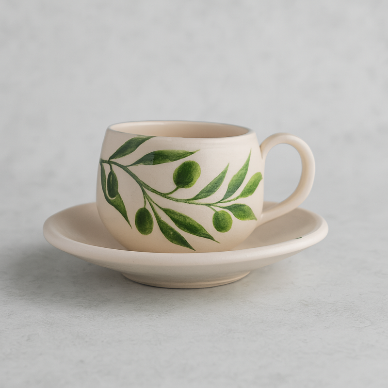 فنجان مع صحن من الخزف صنع على ايدي حرفين طله من البدي لنهاية المنتج مزين بعرق من الزيتون على الفنجان والصحن 15*7 سم