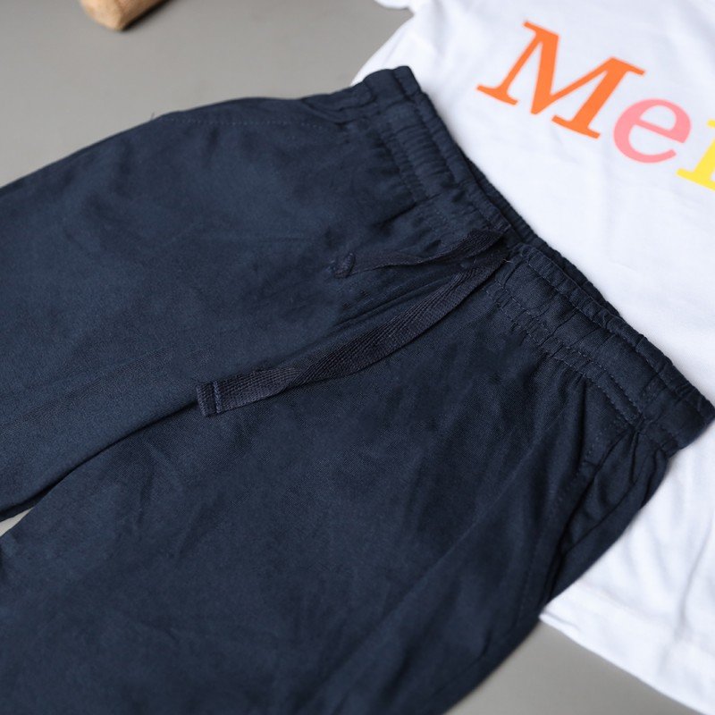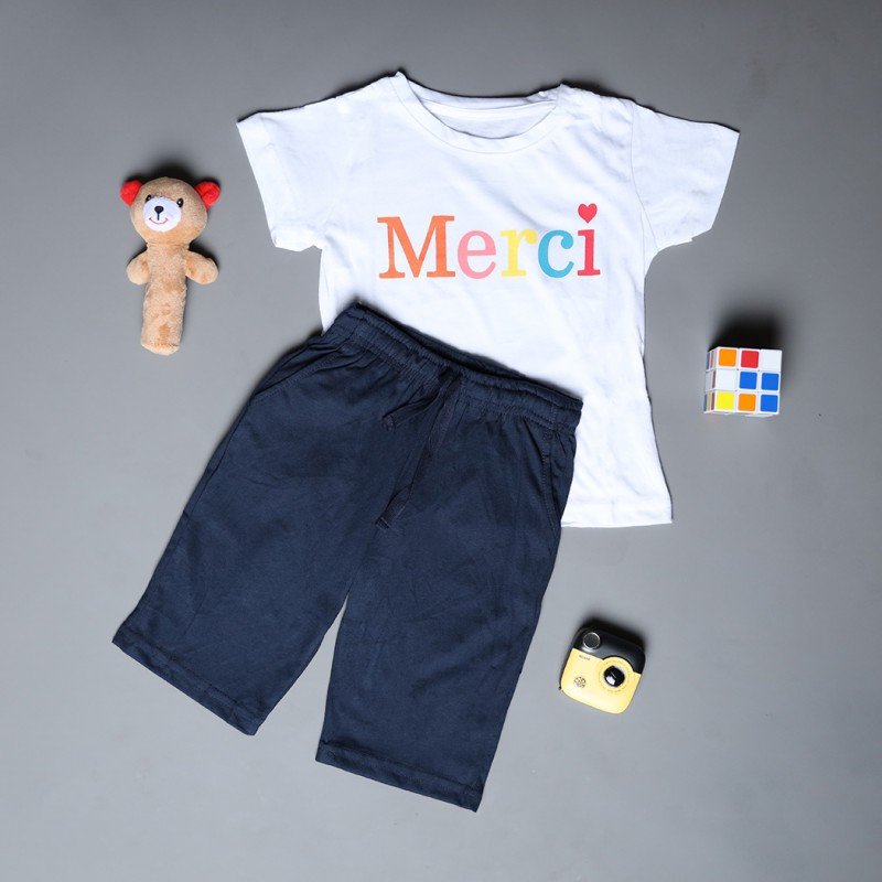 ✅ اللون: تيشيرت أبيض وشورت كحلي.