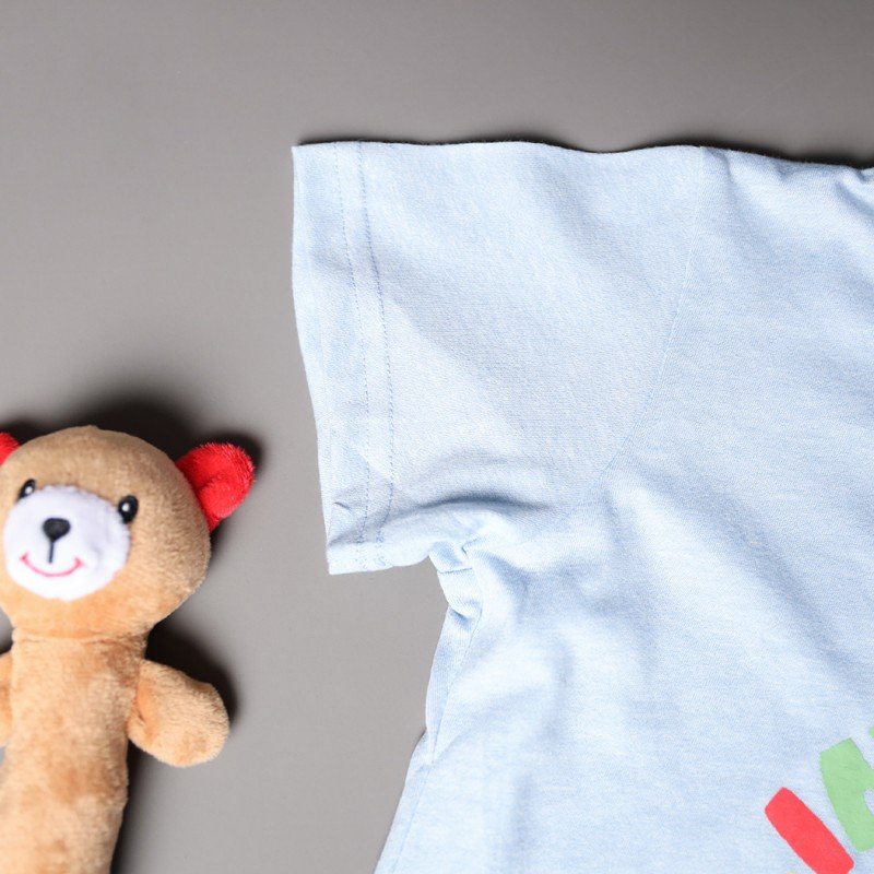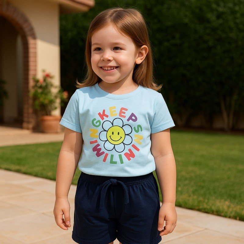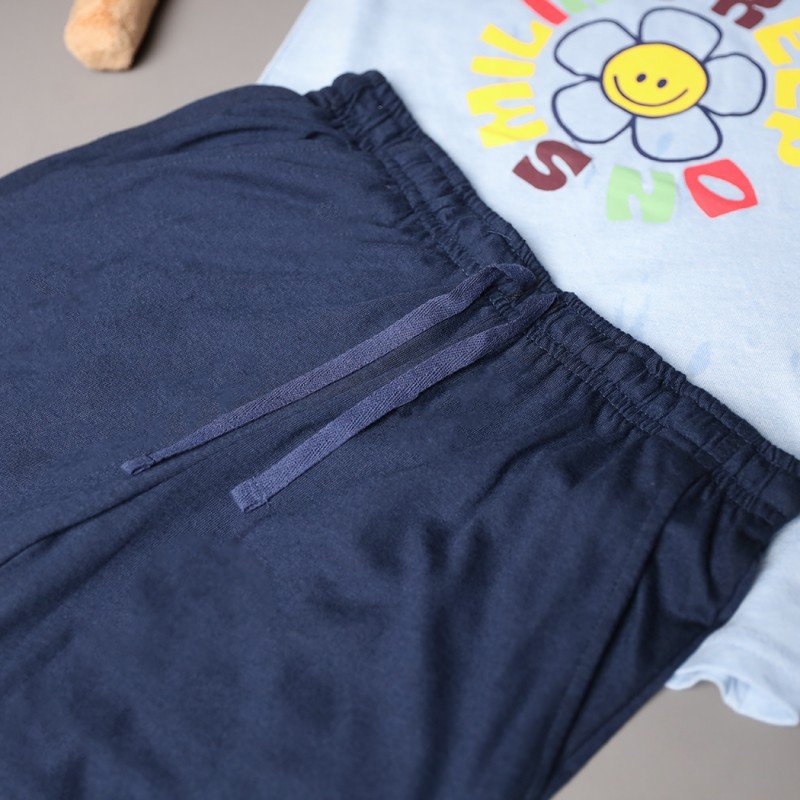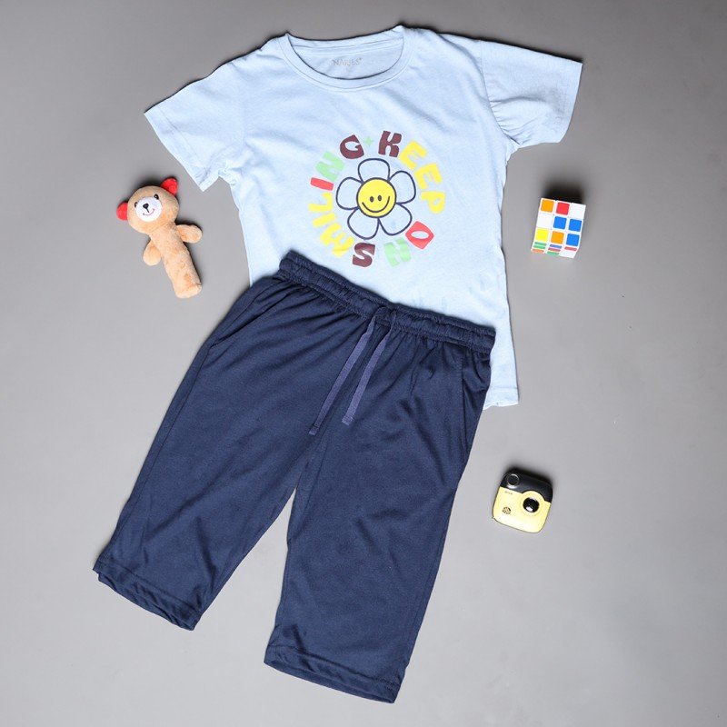 ✅ اللون: تيشيرت أزرق وشورت كحلي.