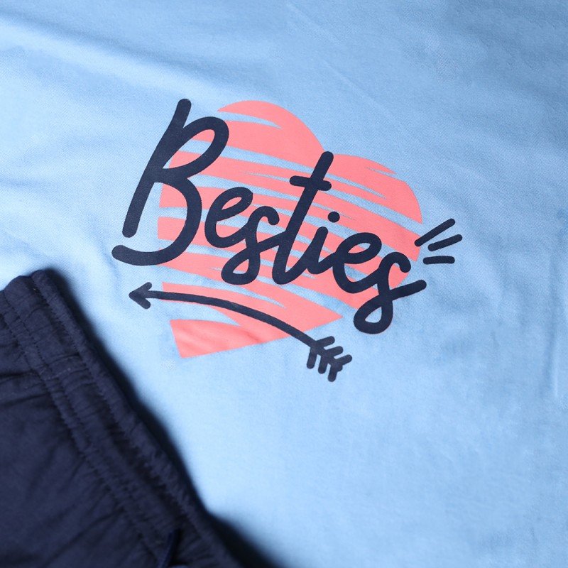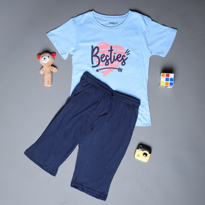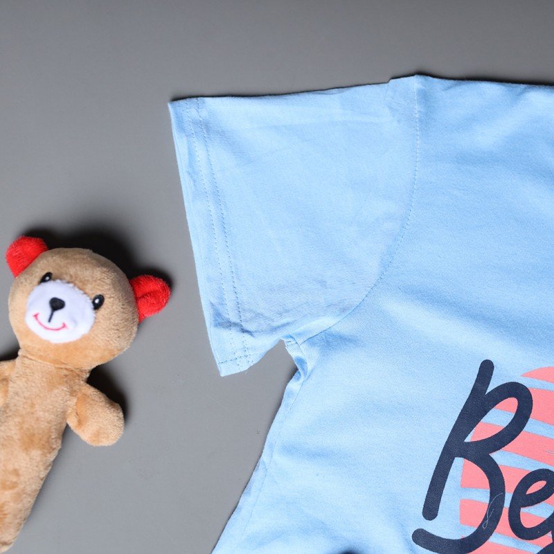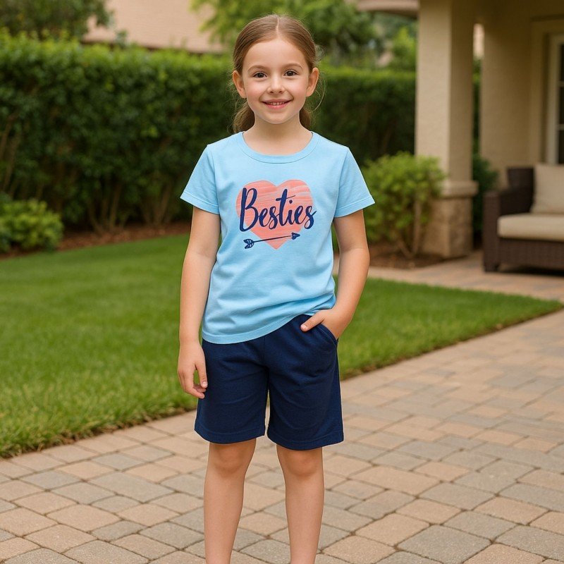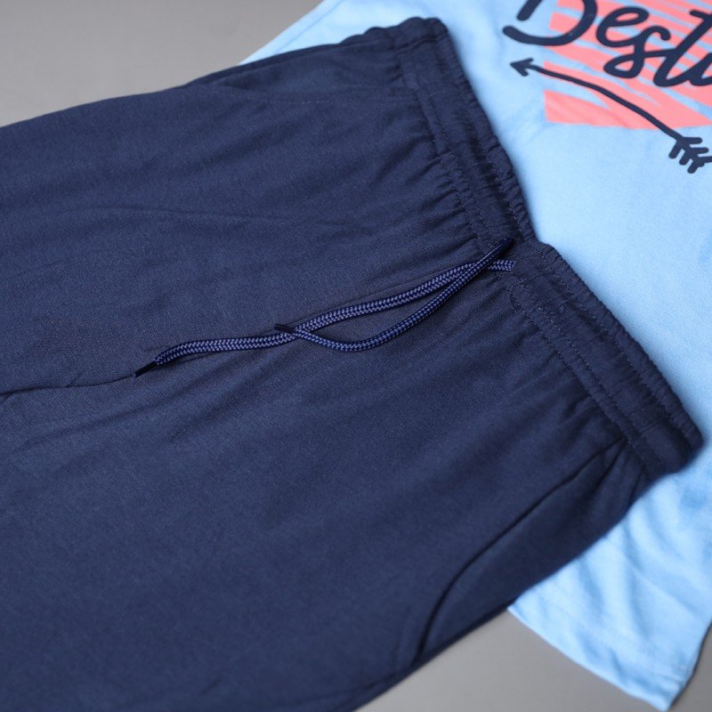 ✅ اللون: تيشيرت أزرق وشورت كحلي.