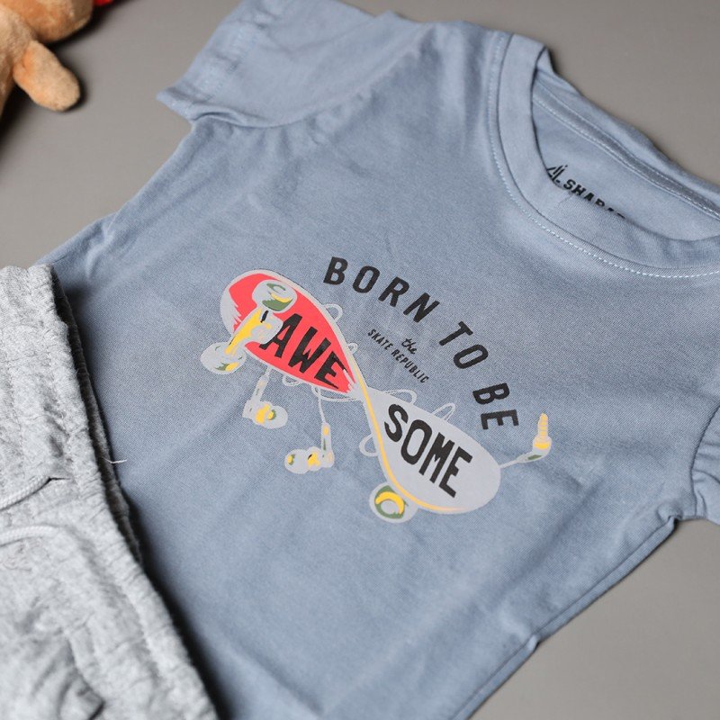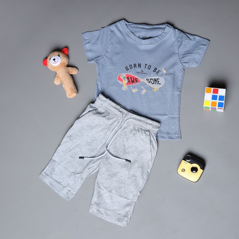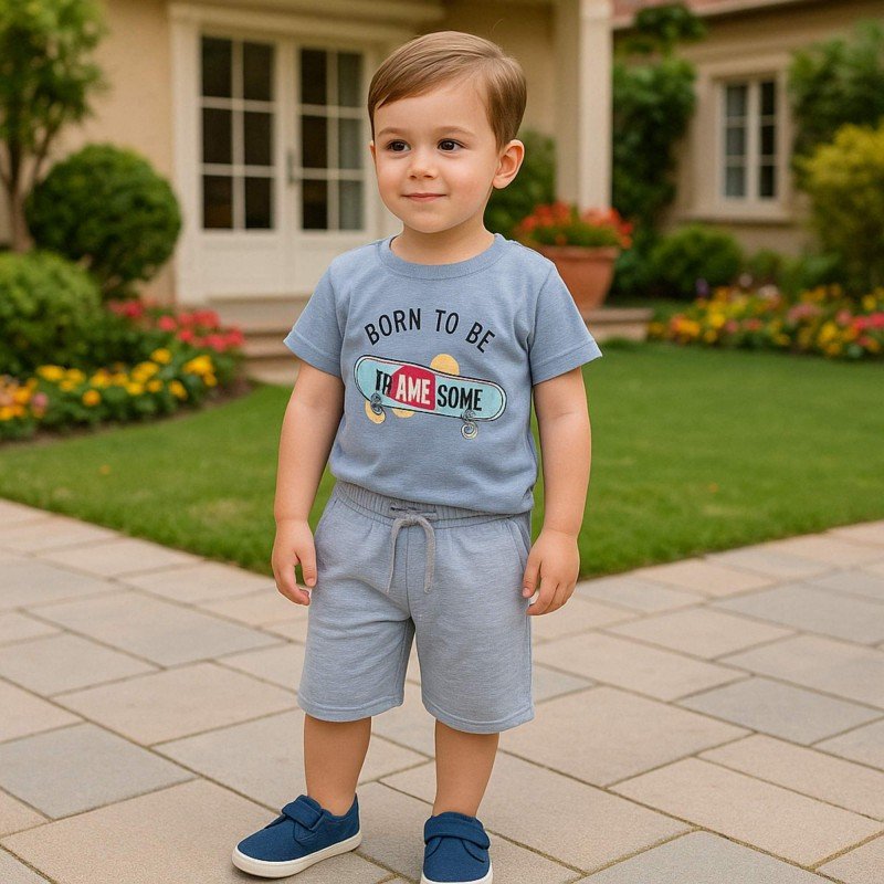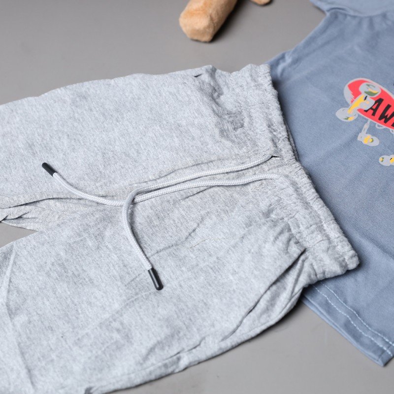 ✅ اللون: تيشيرت بترولي وشورت رمادي.