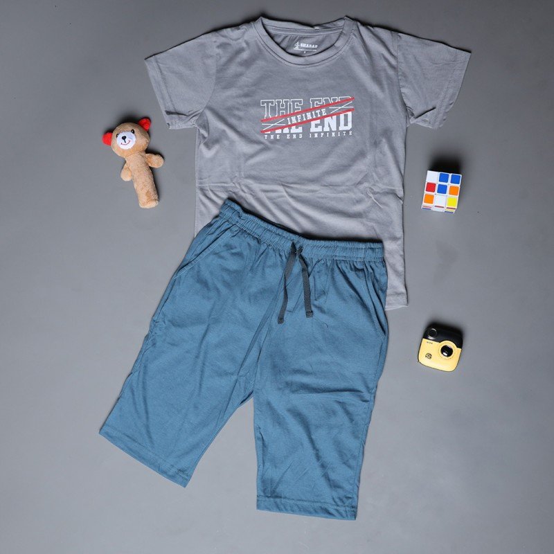 طقم قطعتين تيشيرت وشورت للأطفال لون رمادي وتركواز