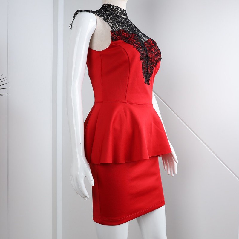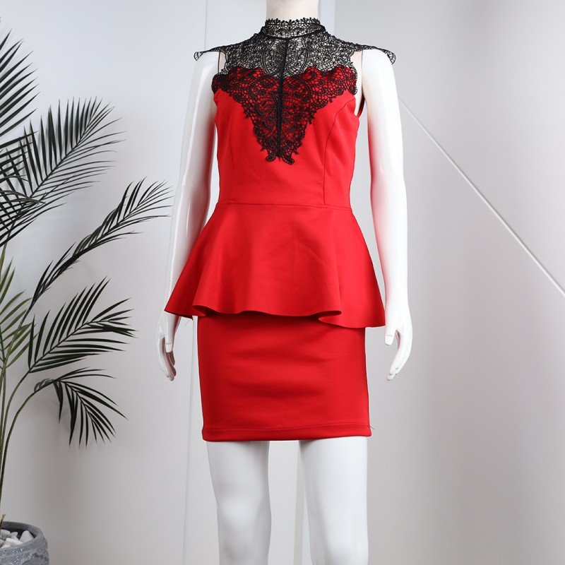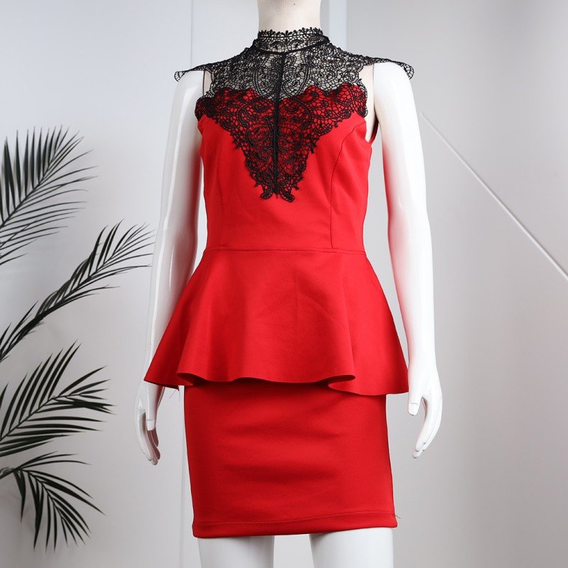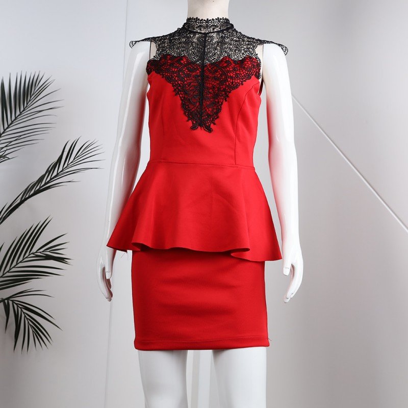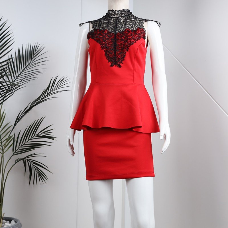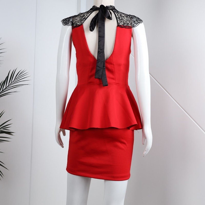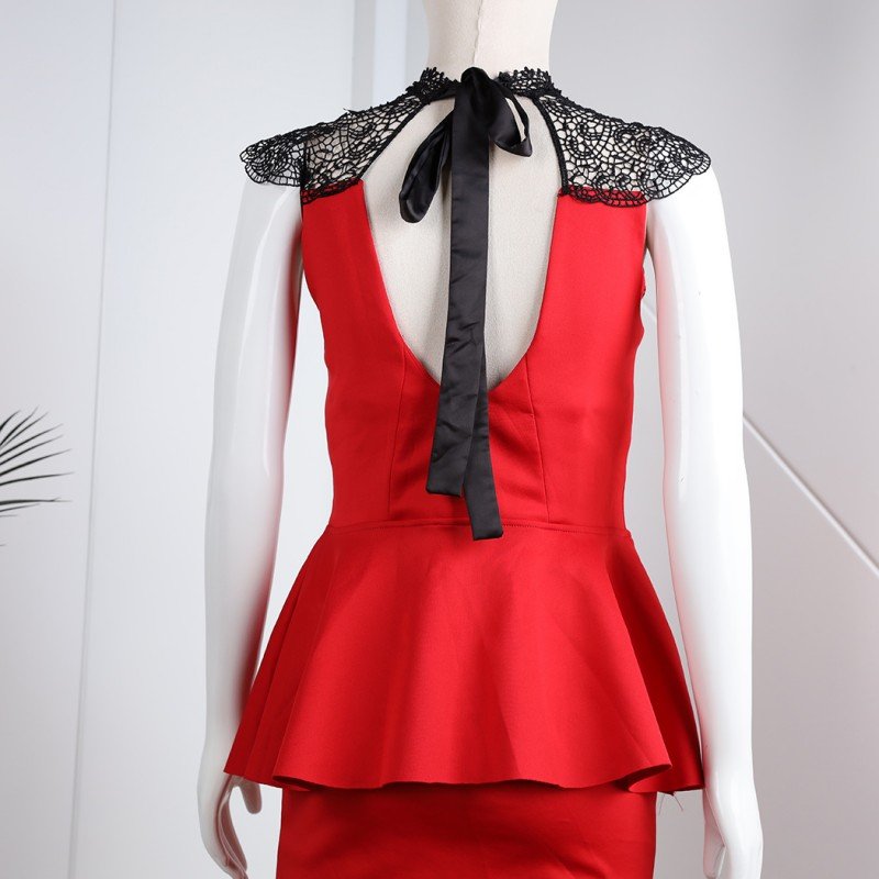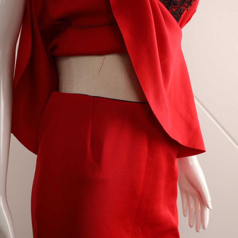 ✅ القطعة الأولى : بلوزة بتصميم دانتيل من الأمام، القطعة الثانية : تنورة سحب قصيرة .