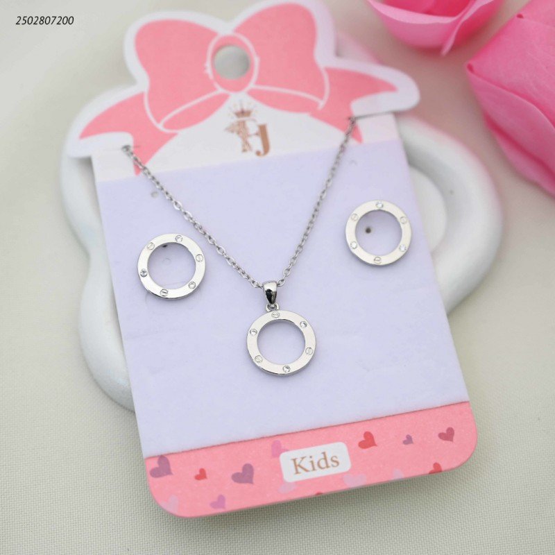 طقم للأطفال سلسال+ وحلق بتصميم ماركة دائري مرصع لون فضي