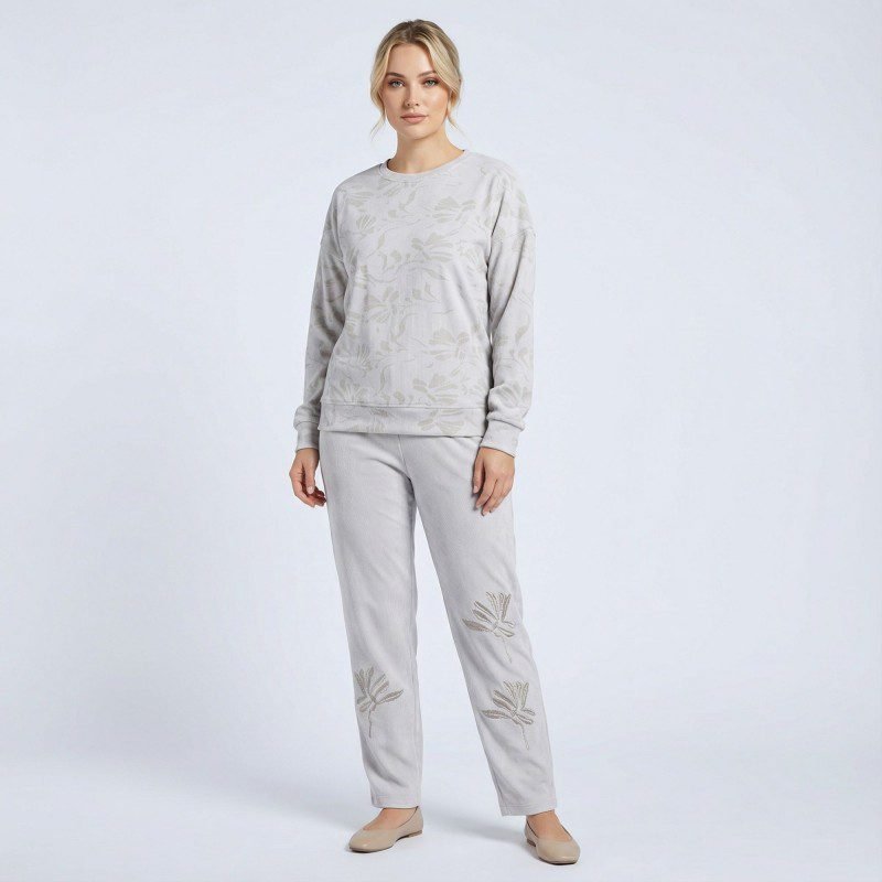 طقم نسائي أنيق من المخمل مكوّن من قطعتين، يتميز بتصميم هادئ ونقشة ناعمة تضيف لمسة راقية دون مبالغة. يأتي باللون السكني الفاتح، ما يجعله سهل التنسيق ومناسبًا للاستخدام اليومي داخل المنزل أو لإطلالة مريحة وبسيطة.