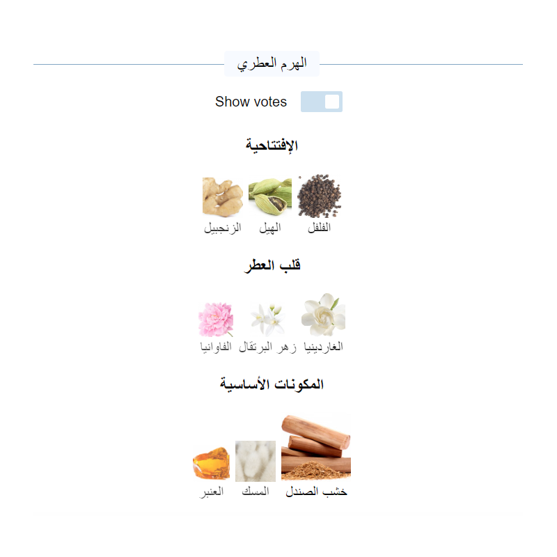 ✅ مكونات وتركيبة العطر: إفتتاحية العطر الفلفل, الهيل و الزنجبيل; قلب العطر الغاردينيا, زهر البرتقال و الفاوانيا; قاعدة العطر تتكون من خشب الصندل, المسك و العنبر.