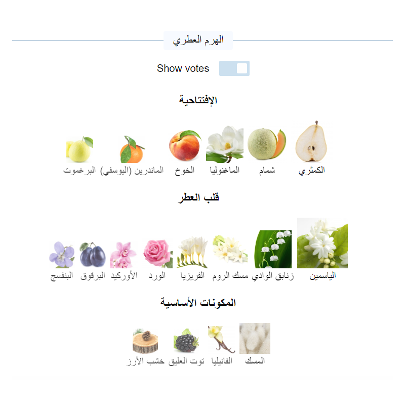 ✅ مكونات وتركيبة العطر: إفتتاحية العطر الكمثري, شمام, الماغنوليا, الخوخ, الماندرين (اليوسفي) و البرغموت; قلب العطر الياسمين, زنابق الوادي, مسك الروم, الفريزيا, الورد, الأوركيد, البرقوق و البنفسج; قاعدة العطر تتكون من المسك, الفانيليا, توت العليق و خشب الأرز.