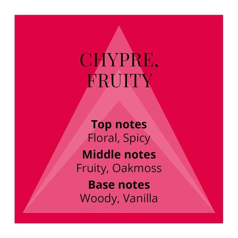 Colour Me Red Milton Lloyd عطر تشيبر – زهري للنساء . إفتتاحية العطر رائحه التوابل, الفريزيا, الفاوانيا و البرغموت; قلب العطر التوت الأحمر, طحلب البلوط (طحلب السنديان), البنفسج, الياسمين و زهر القرنفل; قاعدة العطر تتكون من نجيل الهند, جذور السوسن, خشب الصندل و الفانيليا.||