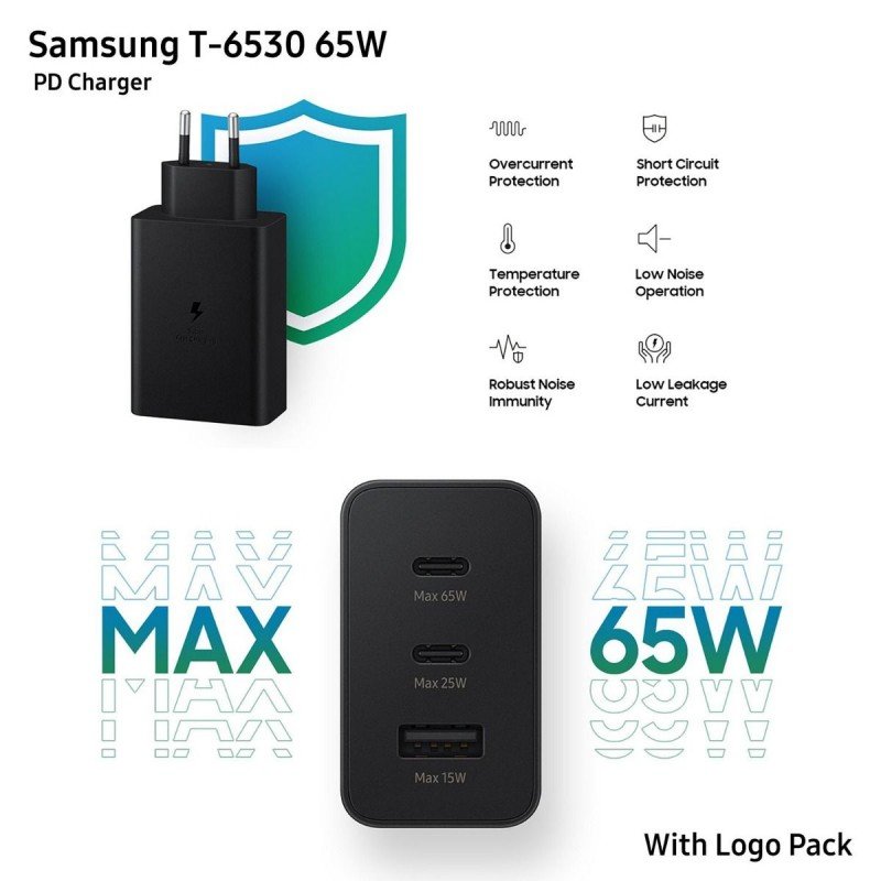 شاحن سامسونج T-6530 65W PD مبكت مع لوجو يمكنك شحن 3 أجهزة في نفس الوقت