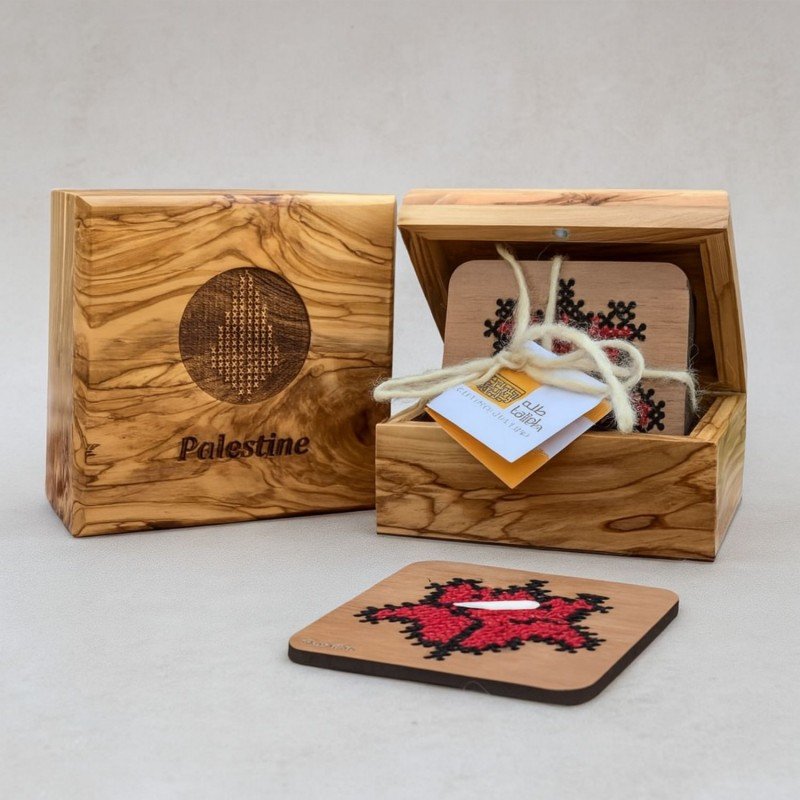 صندوق خشب زيتون فاخر يحتوي على 6 كوسترات تطريز من نقشات المدن الفلسطين (القدس ،الخليل ،غزة ،يافا ،بيت لحم ،رام الله ) 12*12*5 سم